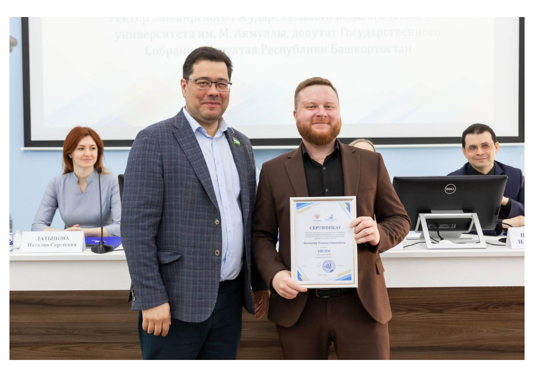Также Салават Талгатович наградил победителей вузовского  конкурса на проведение фундаментальных и поисковых научных исследований  по приоритетным направлениям отдельными научными группами и вручил им денежные сертификаты. Сертификат на 100 тысяч рублей получил доцент кафедры теории и методики физической культуры и спорта Роман Сергеевич Кулешов.