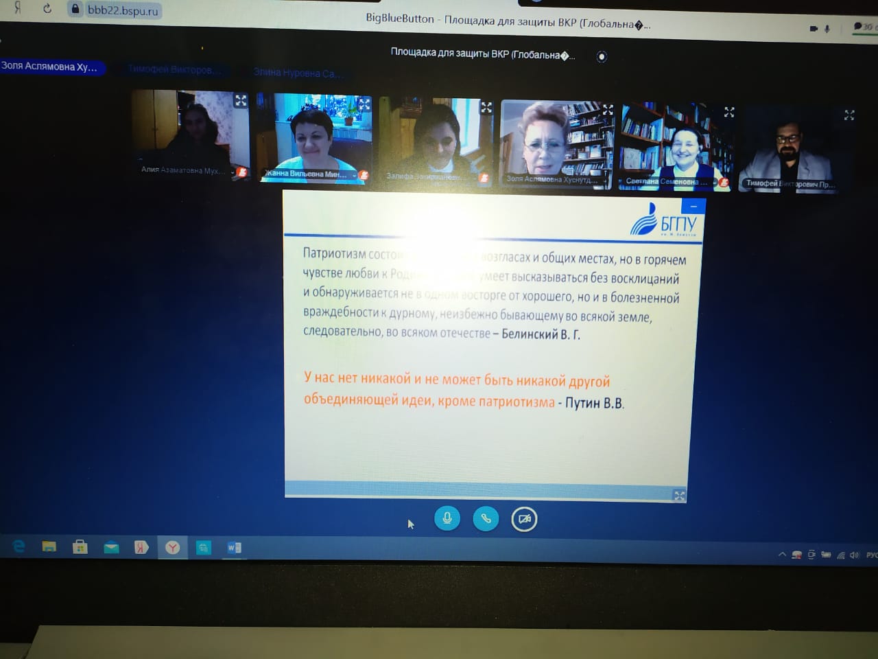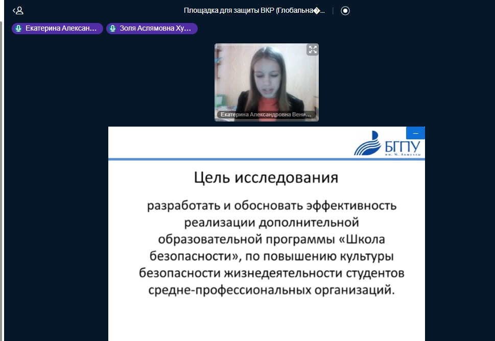 Дистанционный формат работы и учебы не стал препятствием к проведению защиты выпускных квалификационных работ по направлению «Педагогическое образование». Магистранты, обучающиеся по профилю «Образование в области безопасности жизнедеятельности» (с применением ДОТ) представили свои работы государственной аттестационной комиссии, в число которых входили: председатель Государственного комитета Республики Башкортостан по ЧС Фарит Гумеров, начальник отдела Министерства образования и науки РБ Жанна Миникеева, а также ведущие учителя ОБЖ Республики Башкортостан и преподаватели кафедры ОЗ и БЖ.