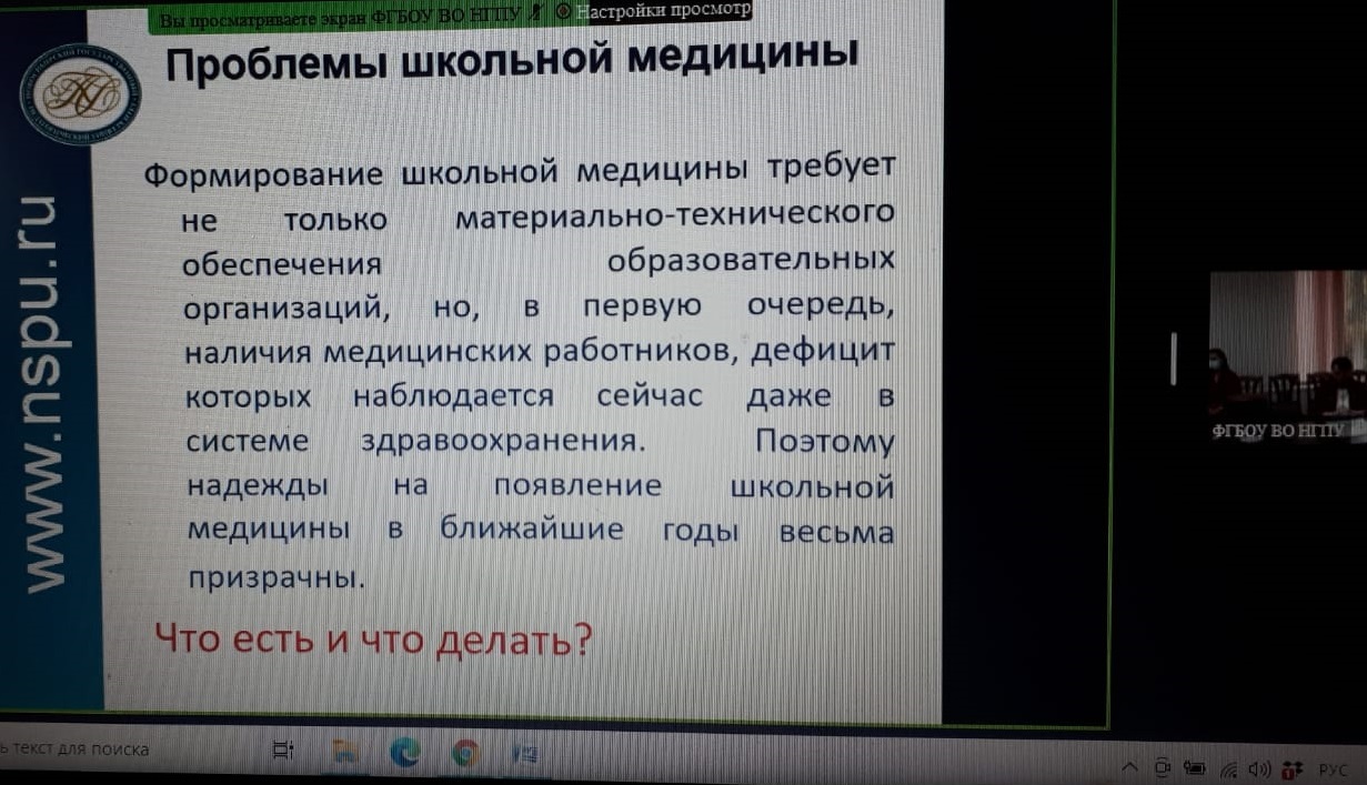 Сегодня общепризнано, что эффективность и качество образовательного процесса в значительной степени зависят от состояния здоровья подрастающего поколения.  К сожалению, показатели здоровья учащейся молодежи имеют выраженную тенденцию к ухудшению. В связи с данной архиважной проблемой, участники совещания отметили актуальность развития школьной медицины, направленной на более активное привлечение школьных педагогов и психологов не только к проведению здоровьесберегающей деятельности, но и к первичной скрининговой диагностике физического и психического здоровья обучающихся. А это, в свою очередь, требует соответствующей подготовки будущих педагогов и психологов уже в стенах педагогических вузов.