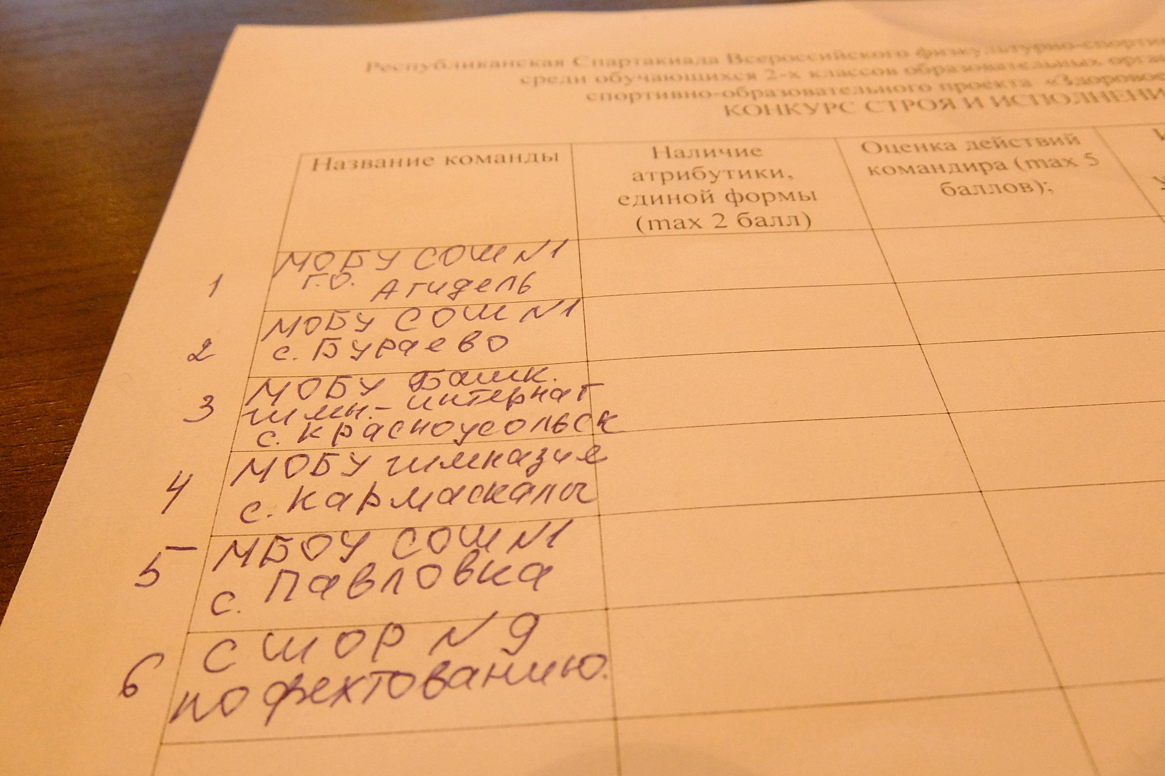 В соответствии с Программой спартакиады был предусмотрен конкурс строя и исполнения строевой песни. Этот конкурс оценивался судейской коллегией сотрудников и преподавателя факультета физической культуры БГПУ им. М. Акмуллы. Старшим судьёй этапа назначен старший преподаватель кафедры охраны здоровья и безопасность жизнедеятельности полковник запаса Голубков Сергей Алексеевич.