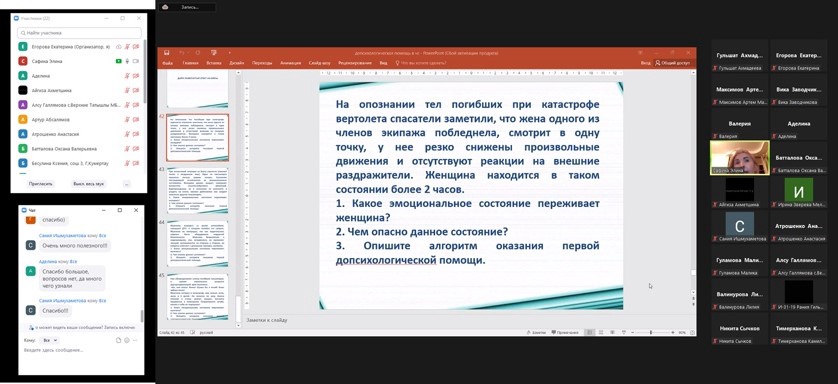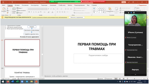 Во второй половине августа 2022 года доценты кафедры ОЗиБЖ Сафина Э.Н. и Мануйлова Г.Р. приняли участие в работе онлайн летнего лагеря для будущих участников Всероссийской олимпиады школьников по ОБЖ, организованного Центром развития талантов “Аврора”. Аудиторию представляли школьники практически из всех городов и районов Республики Башкортостан. Преподавателями кафедры были прочитаны лекции по вопросам оказания первой помощи, психологическим основам безопасности, первой психологической помощи в ЧС.