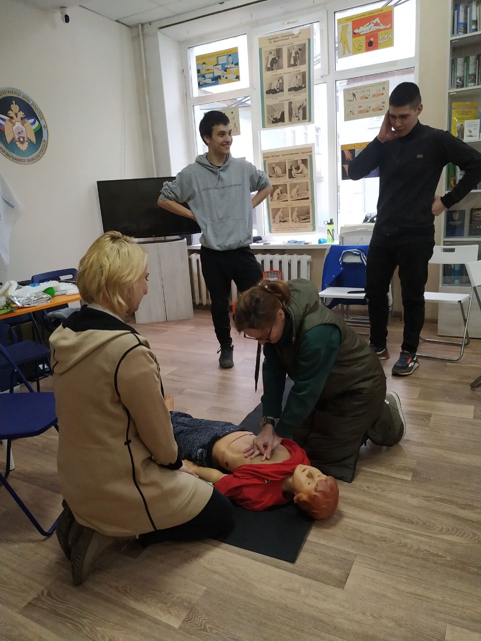 Обучение состояло из теоретической и практической части. На современных роботах –тренажерах взрослые отработали навыки оказания первой помощи при отсутствие сознания и дыхания, попадании инородных тел в дыхательные пути, наружном кровотечении, травмах.