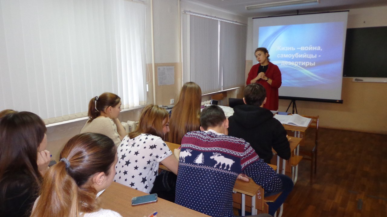 На кафедре ОЗ и БЖ проведен социально-психологический тренинг по профилактике суицидов: «Живу! Люблю! Творю!» Мы выбираем жизнь, а они – смерть. Мы пишем сообщения полные любви и нежности, а они – предсмертные записки. Мы строим планы на будущее, а у них его не будет. Они не рождены потенциальными самоубийцами, …но умерли с этим клеймом. Кажется, что мы и они – из разных миров, но так ли велика пропасть между нами и ими, решившимися на самоубийство? Что должно произойти с человеком такого, чтобы он решился вычеркнуть себя из жизни? Все эти вопросы обсуждали с аудиторией фасилитаторы тренинга: доцент кафедры ОЗ и БЖ Элина Сафина и специалист по работе с молодежью подросткового объединения «Апельсин» Гульнара Гареева. В арт-поставновке «Монологи уцелевших» были представлены реальные истории о людях, совершивших попытку самоубийства, но по стечению обстоятельств, не доведших ее до конца. Истории из жизни людей, решившихся на крайний шаг, вызвали у участников тренинга амбивалентные чувства. Упражнение «Анализ трудных жизненных ситуаций» позволило студентам понять, что практически все кризисные ситуации в жизни – вполне разрешимы. В ходе тренинга студенты самостоятельно разрабатывали стратегию профилактики суицидальных тенденций в образовательном пространстве школы и вуза. В завершении тренинга, в ходе брейнсторминга участники составили рекомендации по повышению компетентности родителей и педагогов в области профилактики суицидального поведения и по повышению личной компетентности в области оказания поддержки и помощи лицам, оказавшимся в тяжелой жизненной ситуации. Кабиров Тагир Рустэмович