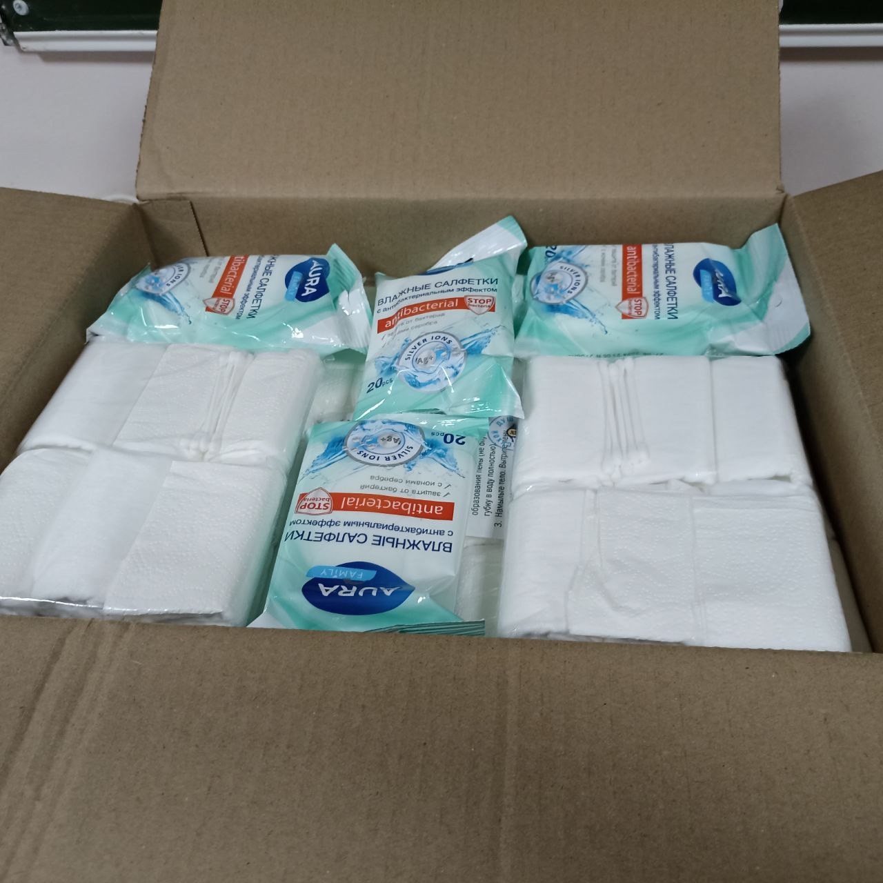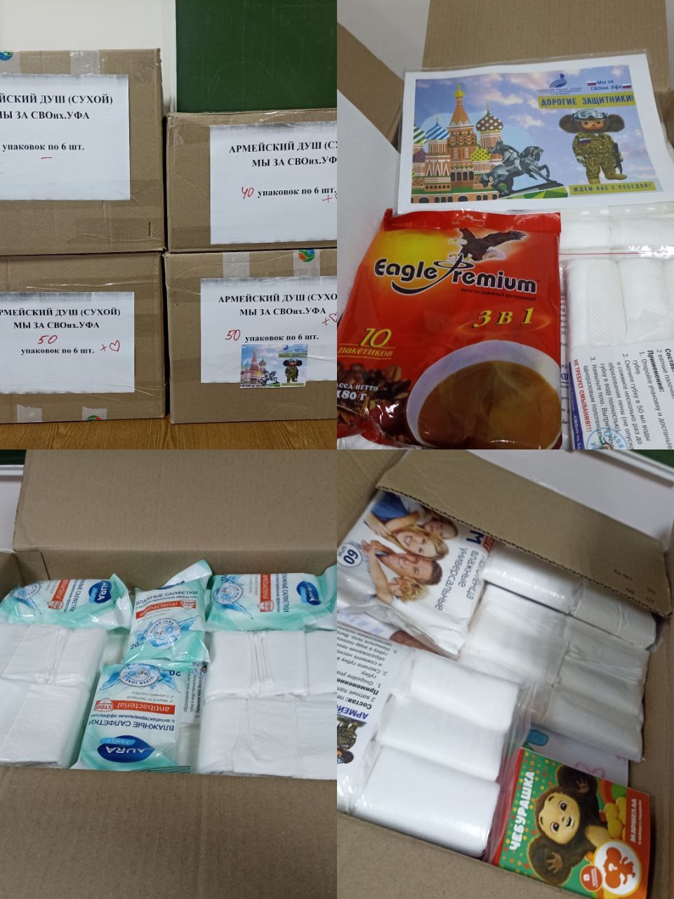 В этой партии — около 500 упаковок армейского сухого душа, а также чай, кофе, влажные салфетки и полотенца.
