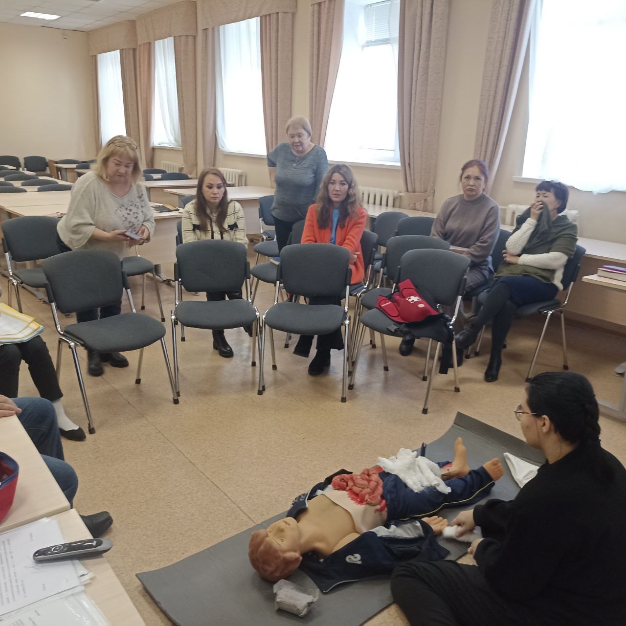 Участники получили актуальную информацию об организационно-правовых основах оказания первой помощи в Российской Федерации, включая особенности организации этой помощи в образовательных учреждениях. На занятии был подробно разобран Универсальный алгоритм оказания первой помощи.  Преподаватели активно участвовали в отработке практических навыков, решая ситуационные задачи.