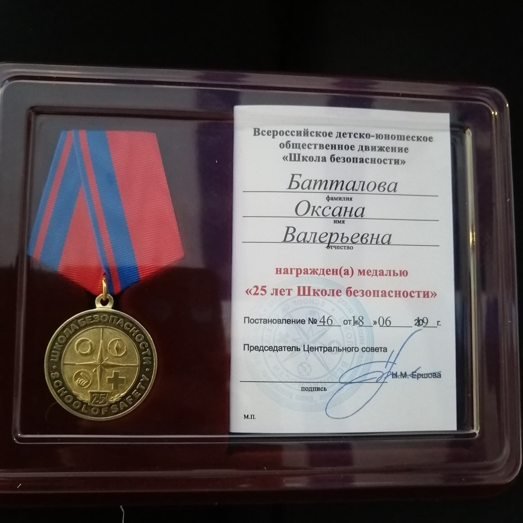 Магистр 1 года обучения по направлению «Образование в области безопасности жизнедеятельности» награждена медалью «25 лет движению «Школа безопасности».