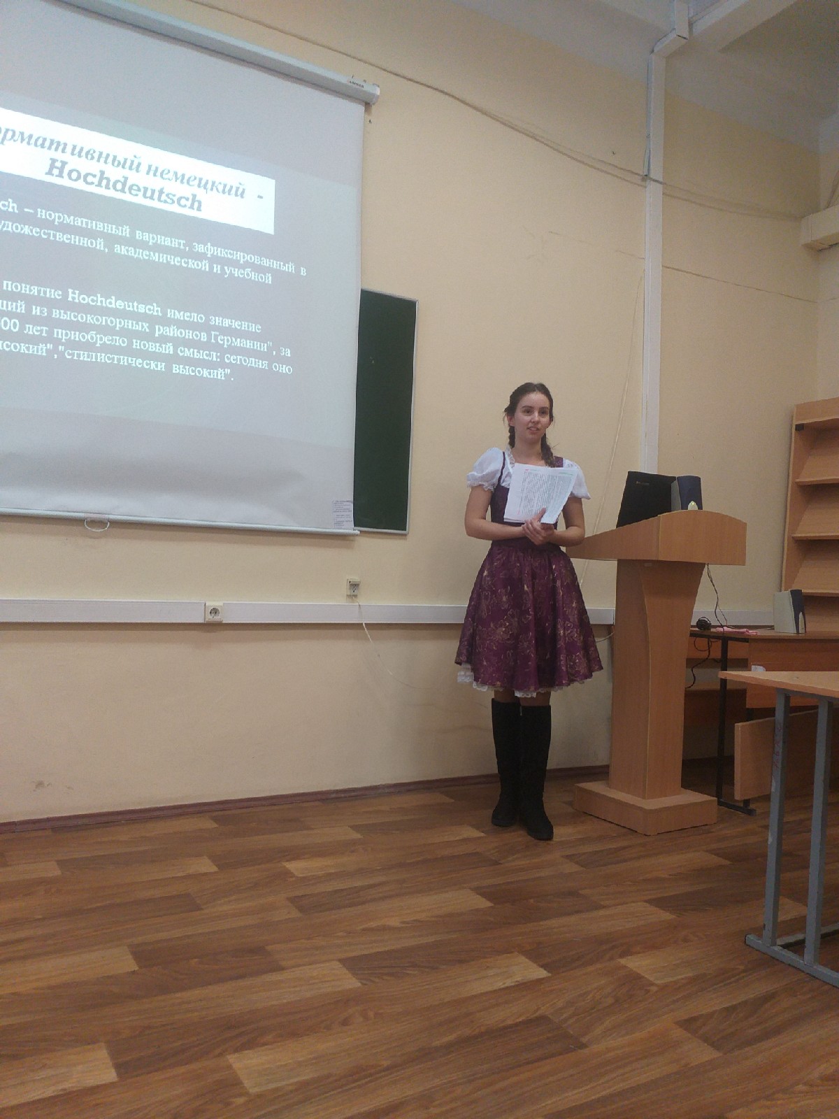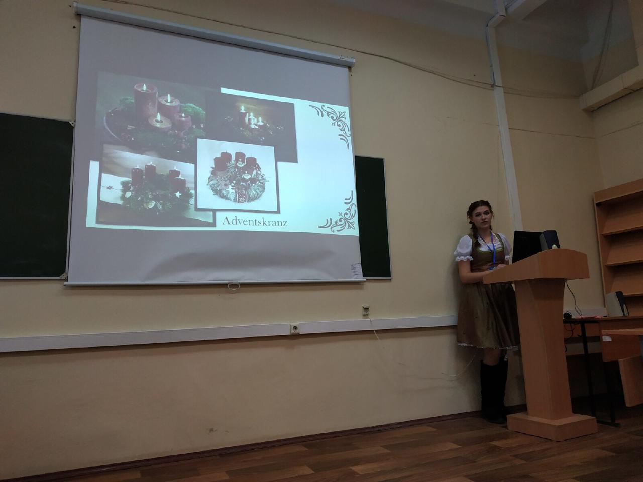 Студенты направления «Педагогическое образование» представляют на этом празднике языков уже несколько лет подряд немецкий язык. В этом году они выступили с докладами о национальных вариантах и диалектах немецкого языка (Рязанова Виталия, 3 курс), о немецких заимствованиях в русском языке (Мухаметьянова Кристина, 3 курс), о вербальных и невербальных способах выражения эмоций в немецкой культуре (Закирзянова Зилина, 3 курс) и о традициях празднования Рождества в Германии (Серпионова Ксения, 3 курс). Сообщения были подготовлены под руководством к.ф.н., доцента кафедры РГЯиЗЛ Галиевой Г.Р.