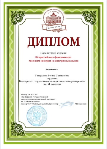 Студентка 3 курса направления подготовки «Педагогическое образование» направленность «Английский язык. Немецкий язык» Гатауллина Регина (под руководством доц. Галиевой Г.Р.) приняла участие в I Всероссийском фонетическом песенном конкурсе на иностранных языках. Организатором конкурса выступил ТОГБОУ ВО «Тамбовский государственный музыкально-педагогический институт им. С.В. Рахманинова». Выступление нашей студентки с композицией легендарной немецкой группы «Rammstein» „Ohne dich“ („Без тебя“) принесло ей победу и диплом I степени в этом конкурсе. Мы сердечно поздравляем Регину и желаем ей дальнейших успехов!!!