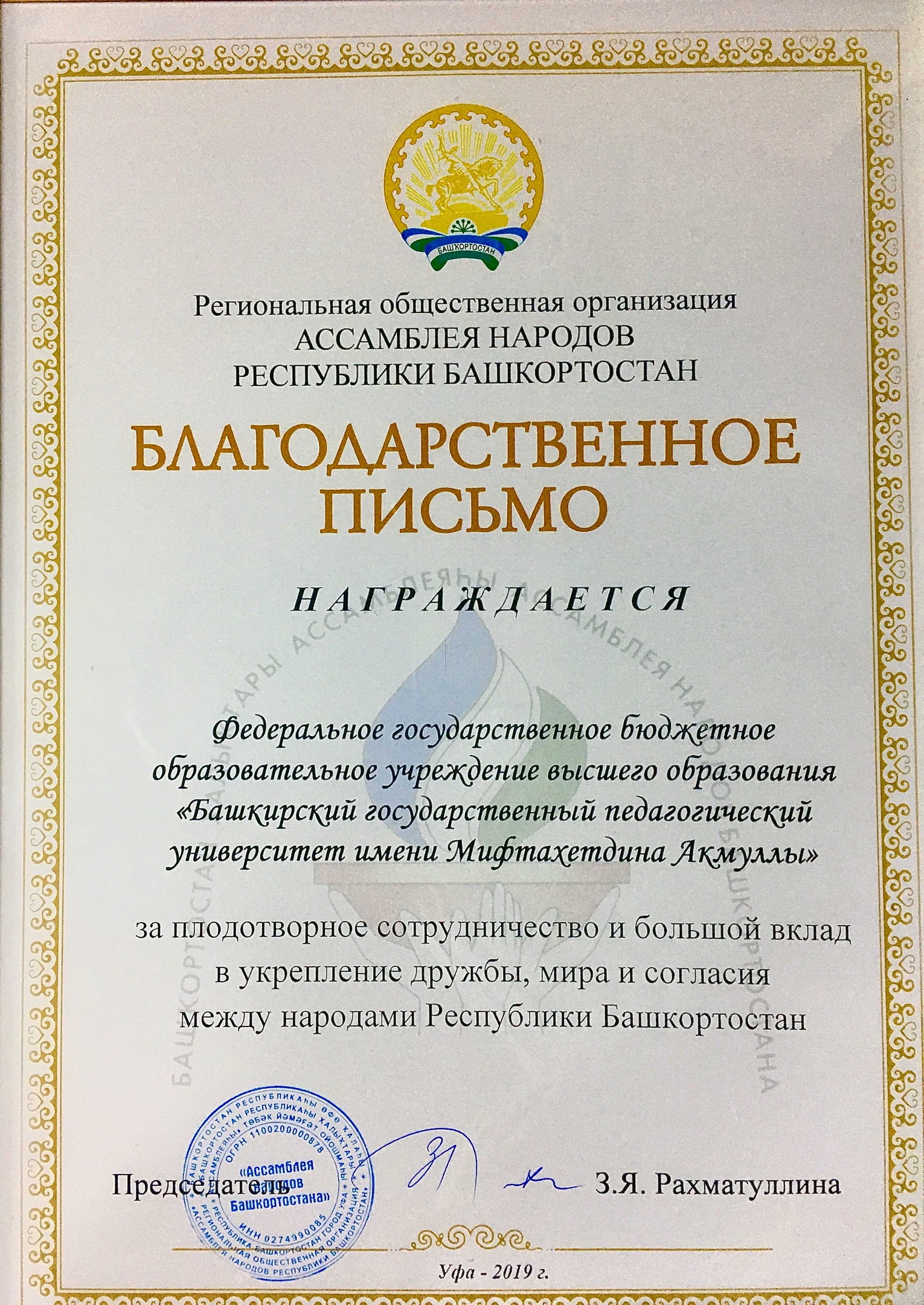 Акмуллинский университет получил благодарность Ассамблеи народов Республики Башкортостан