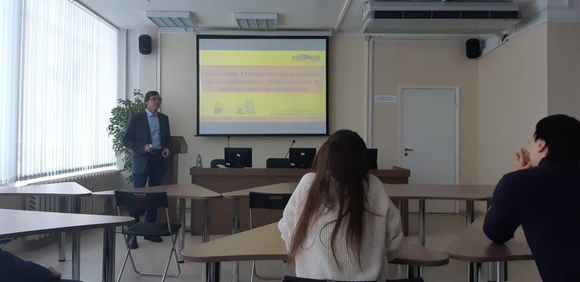 С научным докладом «Великая Отечественная война: фальсификации, мифологемы и дискуссионные вопросы», который вызвал большой интерес аудитории, выступил доцент кафедры Отечественной истории Р.З. Алмаев. В состоявшейся вслед за тем дискуссии приняли активное участие как преподаватели и студенты нашего университета, так и школьники. Обсуждение показало всю остроту поставленной проблемы – это одна из важнейших составных частей той гигантской идеологической борьбы, которую ведет Россия со своими геополитическими противниками и их союзниками, борьбы, во главу угла которой поставлены не только роль СССР во Второй мировой войне, но и честь, достоинство и авторитет нашей Родины, её право быть суверенным, ни от кого независящим государством.