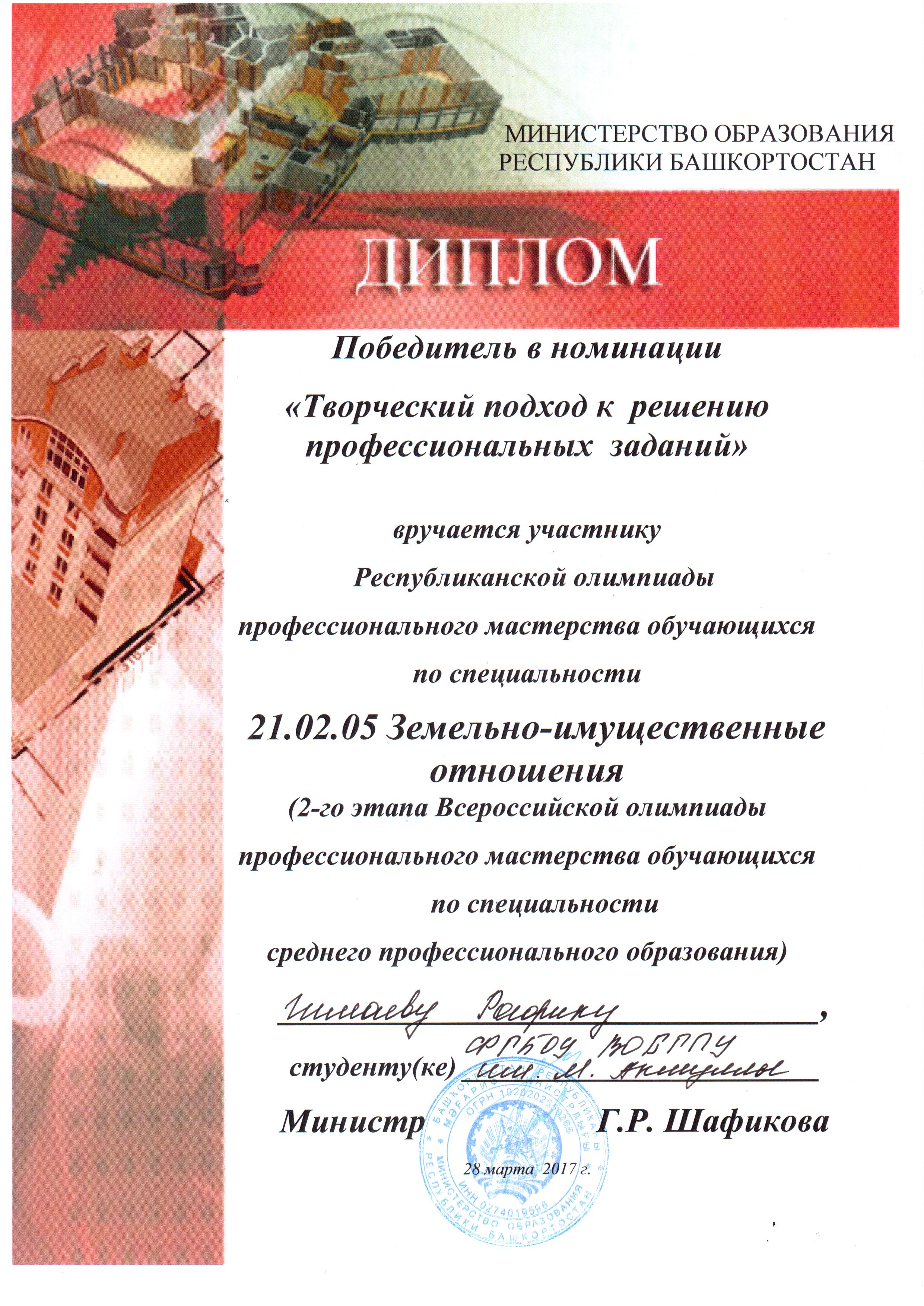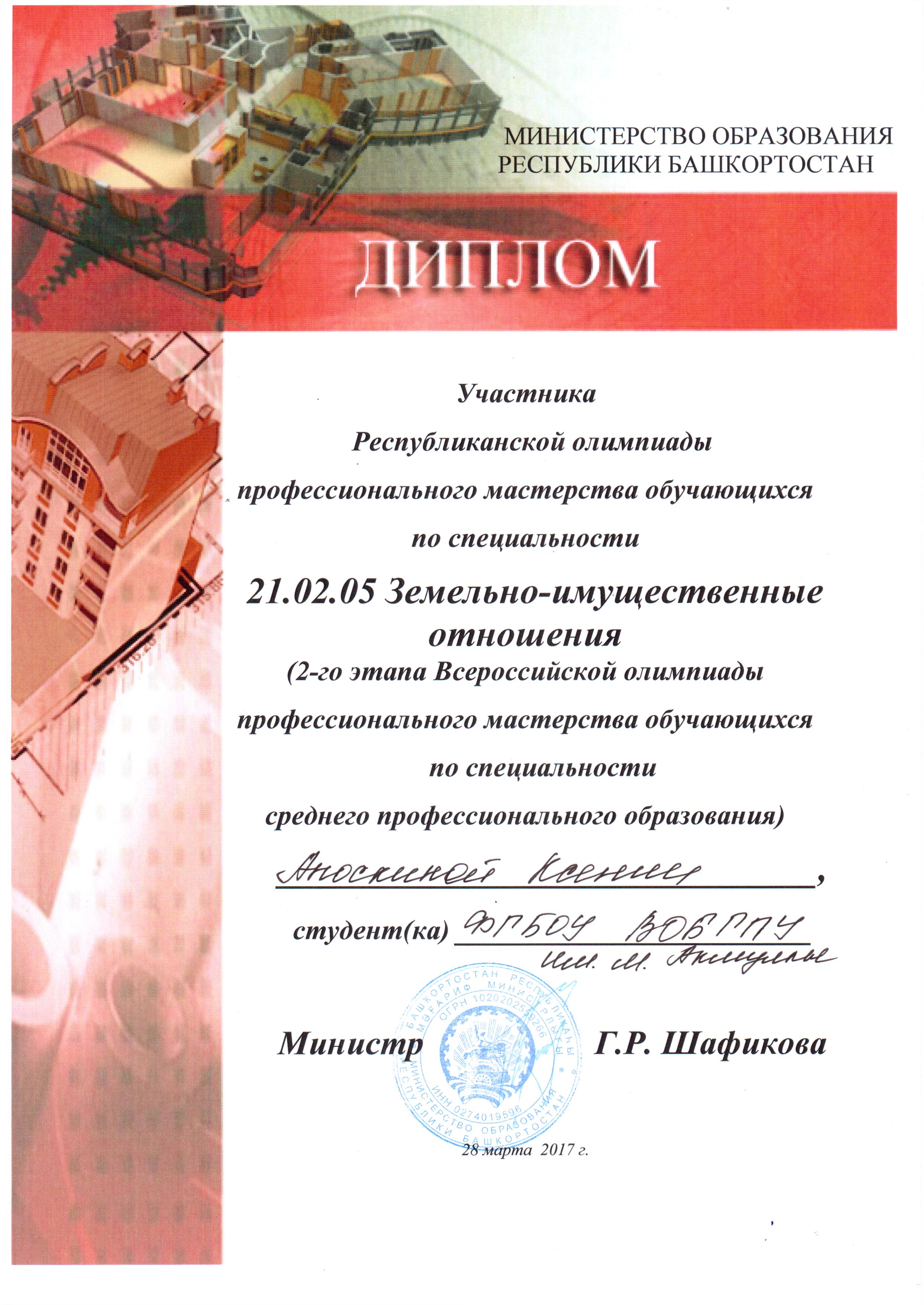 28 марта 2017 года на базе Башкирского колледжа архитектуры, строительства и коммунального хозяйства прошел региональный этап Всероссийской олимпиады профессионального мастерства по УГС 21.00.00 «Прикладная геология, горное дело, нефтегазовое дело и геодезия» (специальности 21.02.05 «Земельно-имущественные отношения», 21.02.06 «Информационные системы обеспечения градостроительной деятельности»).