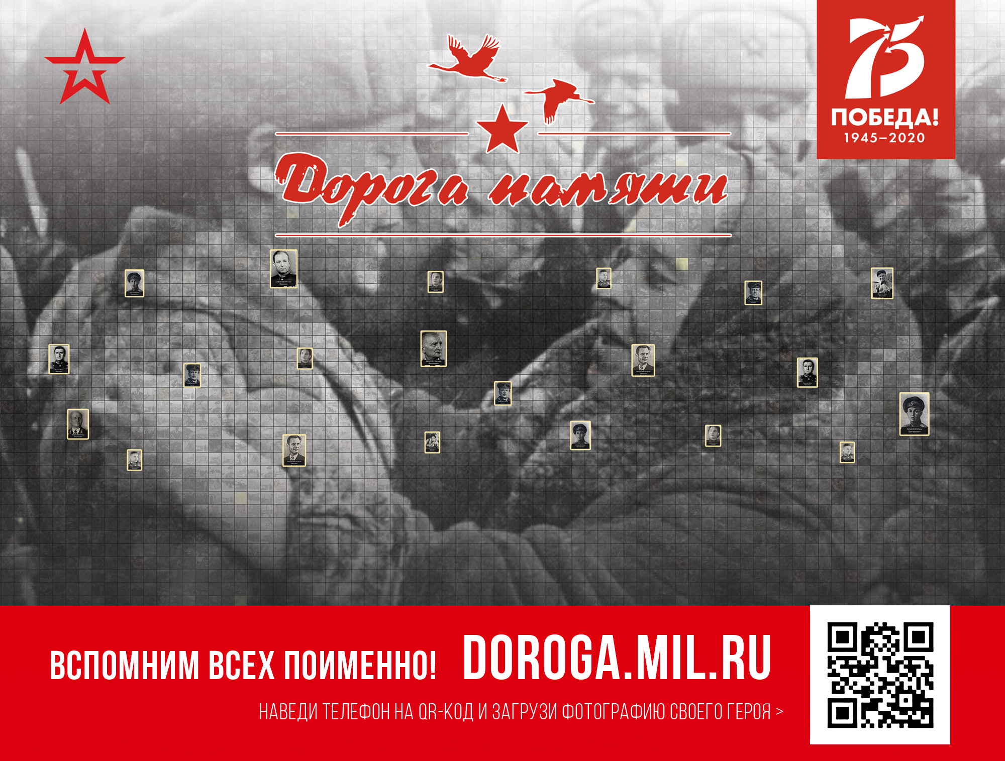 «Дорога памяти» — это общедоступная единая база данных о каждом участнике Великой Отечественной войны. Проект реализуется Министерством обороны Российской Федерации. Свое воплощение «Дорога памяти» найдет в виде крупнейшего памятника с именами и портретами героев Великой Отечественной войны на территории военно-патриотического парка культуры и отдыха «Патриот», где строится Главный храм Вооруженных Сил России.