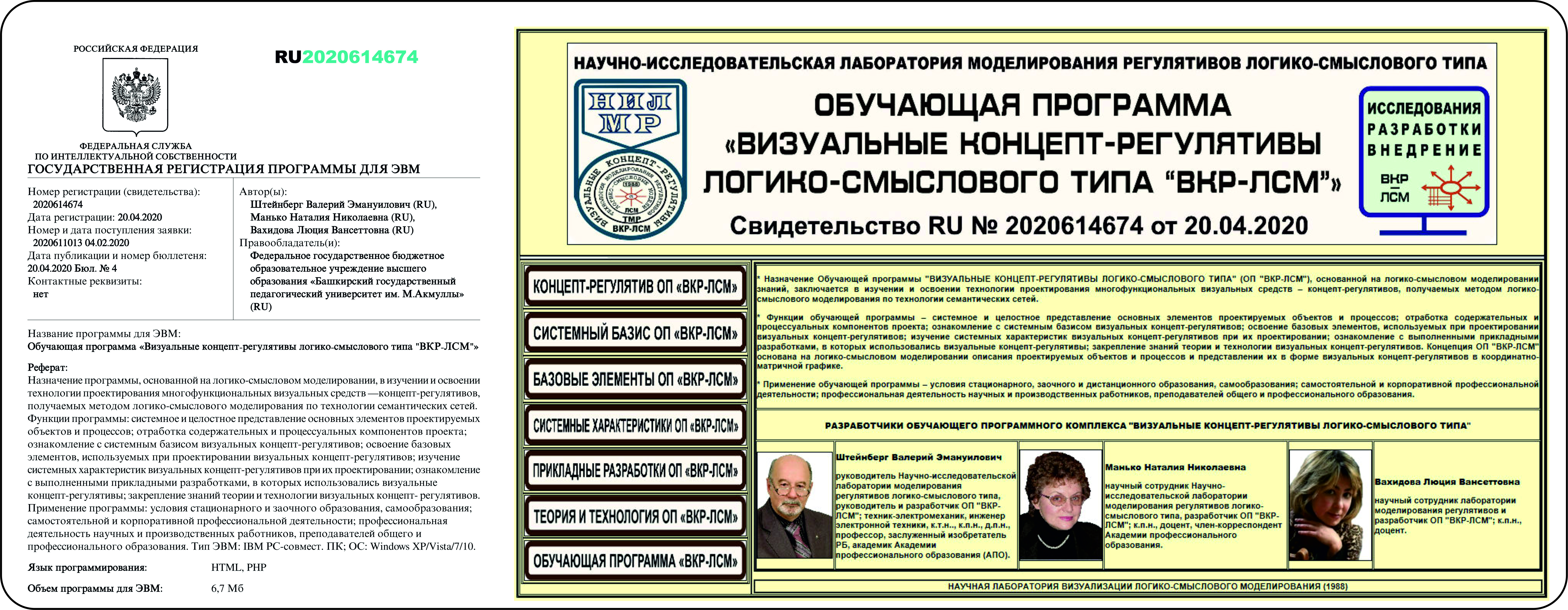 Свидетельство RU2020614674 от 20.04.2020. Штейнберг В.Э., Манько Н.Н., Вахидова Л.В. Обучающая программа «Визуальные концепт-регулятивы логико-смыслового типа "BKP- ЛСМ"»