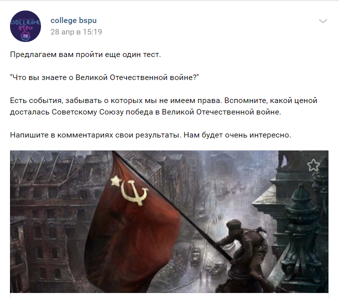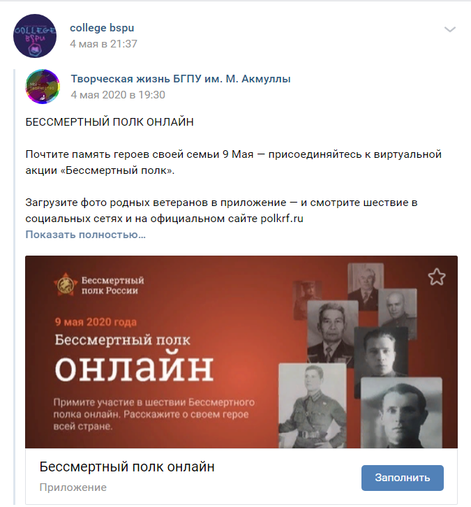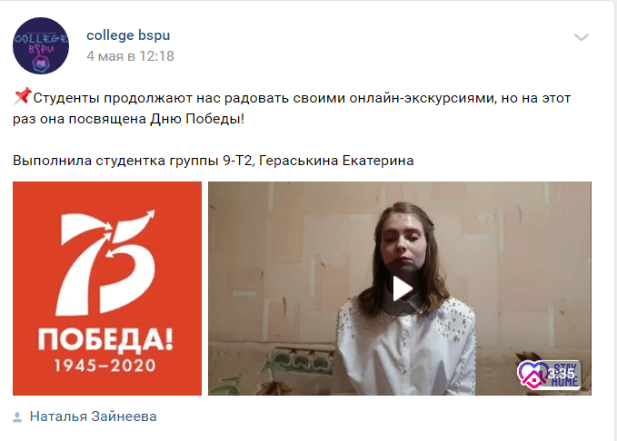 Начиная с середины апреля, ребята ежедневно запускали акции, конкурсы и экскурсии, посвящённые Великой Победе, которые выкладывали в официальной группе Колледжа БГПУ им. М. Акмуллы в социальной сети «Вконтакте» «college bspu» с хештегами #творидобро #оставайсядома. Благодаря этому, преподаватели и студенты колледжа смогли принять участие в дистанционных онлайн мероприятиях в эти предпраздничные недели.