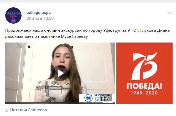 На страницах сообщества можно было попасть на виртуальную книжную выставку «Отстоим Москву», созданную студенткой колледжа специальности «Библиотековедение»; пройти онлайн-тесты «Города-герои» и «Что вы знаете о Великой Отечественной войне»; присоединиться к виртуальной акции «Бессмертный полк». Узнать историю памятников М.Гарееву и А.Матросову, послушать информацию о Герое Советского Союза Пикулеве Александре Степановиче, открыть для себя боевые подвиги танка Т-34, побывать в музее и парке Победы – всё это стало возможным благодаря серии онлайн экскурсий по Уфе, которые подготовили на русском и английском языках студенты специальности «Туризм» под руководством Зайнеевой Н.В.