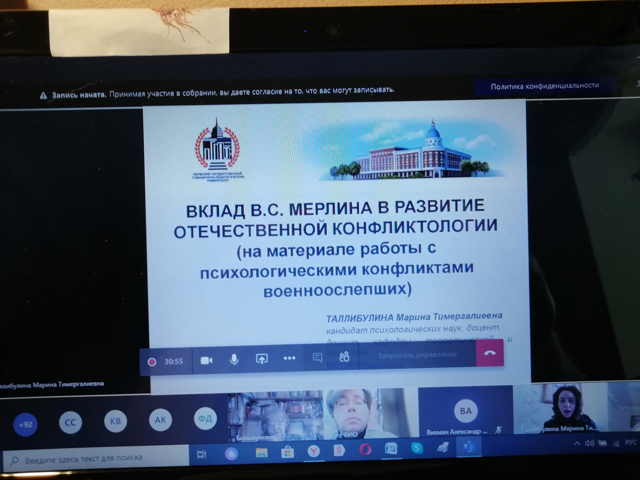 На конференции были заслушаны и обсуждены два интереснейших доклада доцентов ПГГПУ Таллибулиной М.Т. «Вклад В.С. Мерлина в развитие отечественной конфликтологии (на материале работы с психологическими конфликтами военноослепших)» и Смирнова Д.О. «Идеи системной интеграции индивидуальности субъектов обучения в пространстве «Школа - ВУЗ» и психологическая практика», а также состоялась презентация монографии В.С. Мерлина «Основы психологии личности» (Пермь, 2020), подготовленная учеником Мерлина В.С., профессором, доктором психологических наук Б.А. Вяткиным.