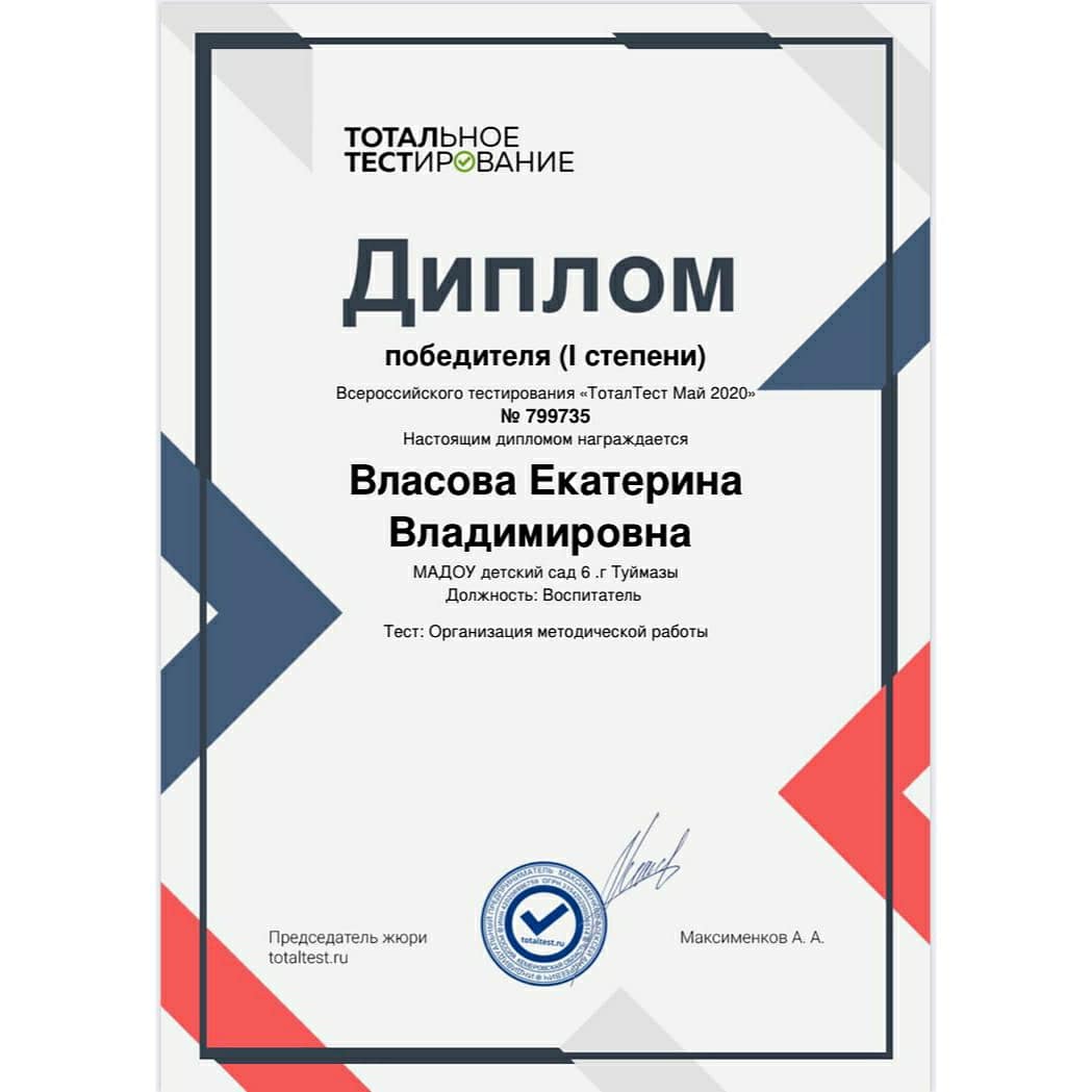 Студентка 2 курса по направлению подготовки «Педагогическое образование», профиль «Дошкольное образование» Власова Екатерина Владимировна получила ДИПЛОМ победителя (1 степени) Всероссийского онлайн-тестирования «Тотал – тест Май 2020» по «Организации методической работы».