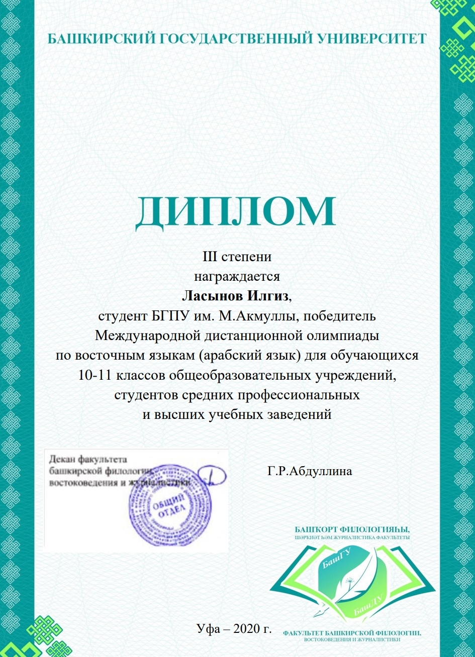 3 апреля 2020 года в БашГУ прошла Международная дистанционная олимпиада по восточным языкам для обучающихся общеобразовательных учреждений и средних специальных и высших учебных заведений Российской Федерации и стран ближнего, дальнего зарубежья, изучающие арабский, китайский, корейский, персидский, турецкий языки.