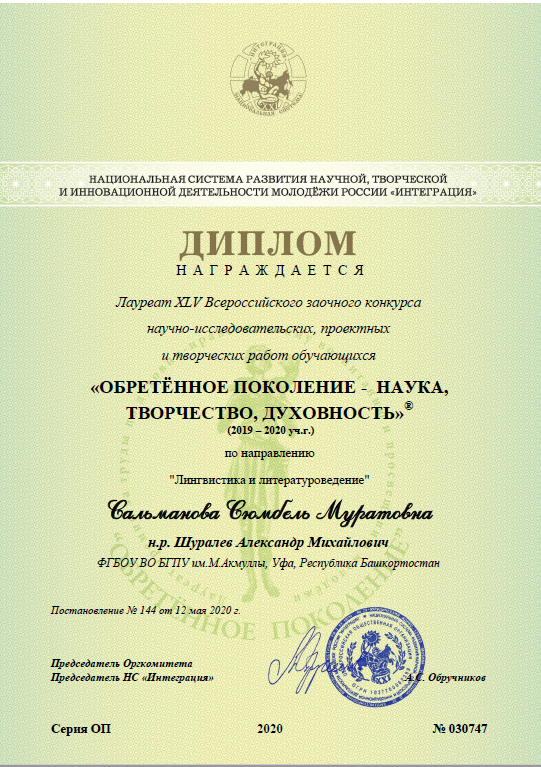 Магистрант 2 курса ИФОМК Сальманова Сюмбель Муратовна под научным руководством профессора кафедры русской литературы А.М.Шуралёва стала лауреатом XLV Всероссийского заочного конкурса научно-исследовательских, проектных и творческих работ обучающихся «Обретённое поколение – наука, творчество, духовность» по направлению «Лингвистика и литературоведение».