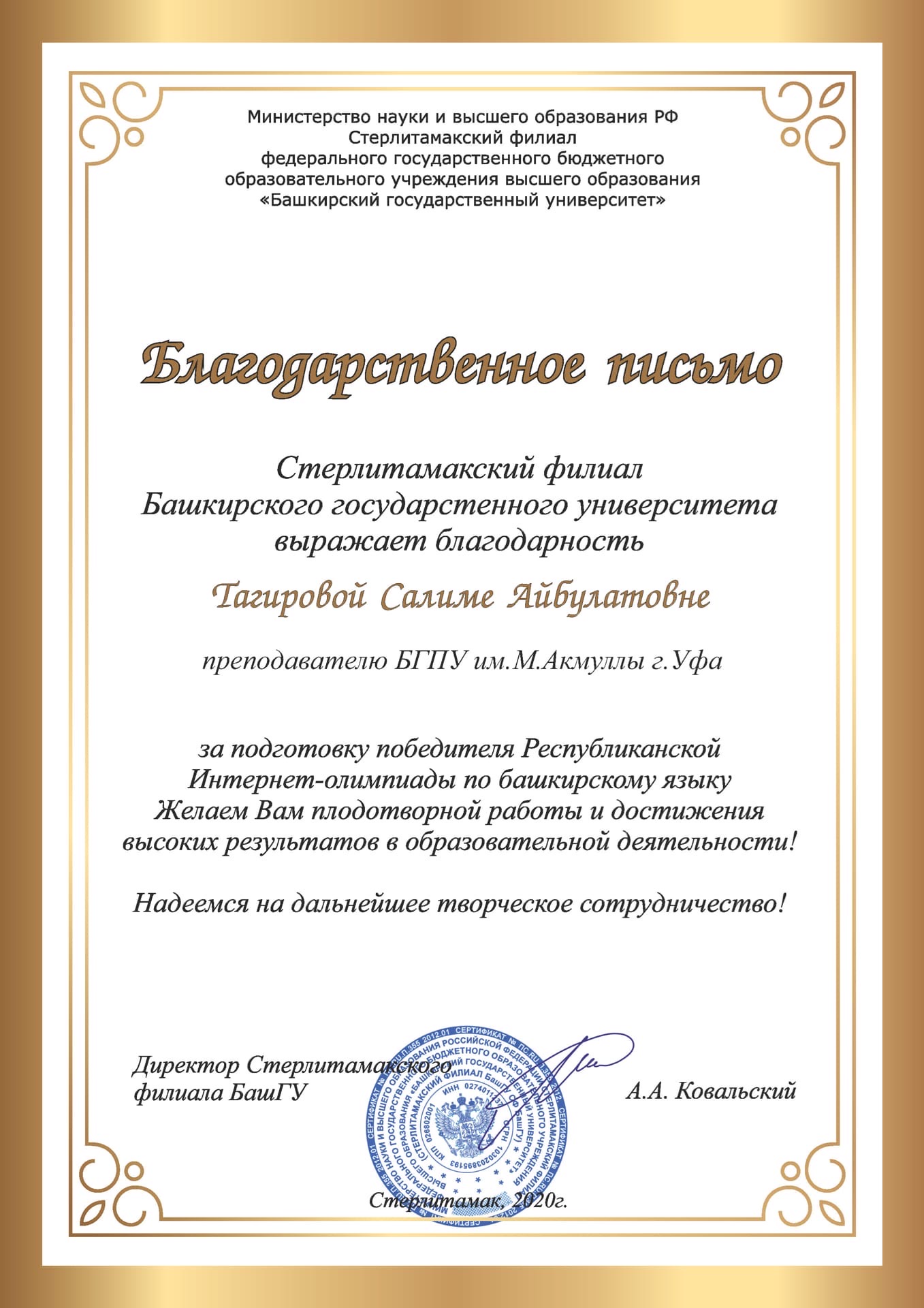 Поздравляем студентку 3 курса БГПУ им.Акмуллы факультета башкирской филологии  Миляушу Шарафутдинову, которая стала победительницей  3 степени Республиканской интернет-олимпиады по башкирскому языку.  Руководитель Салима Айбулатовна. Желаем в дальнейшем  хороших достижений и высоких результатов!