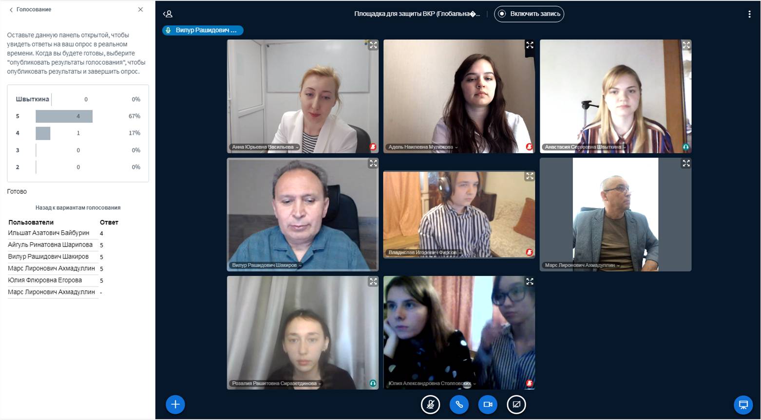 Защита ВКР показала, что и студенты, и государственные экзаменационные комиссии, и университет справились с новыми вызовами и готовы к формату проведения государственной итоговой аттестации с применением дистанционных образовательных технологий как технически, так и психологически. Также, до самой защиты студентам и руководителям выпускных работ в течение месяца была доступна аналогичная площадка видеоконференцсвязи для проведения консультаций и репетиционных предзащит.