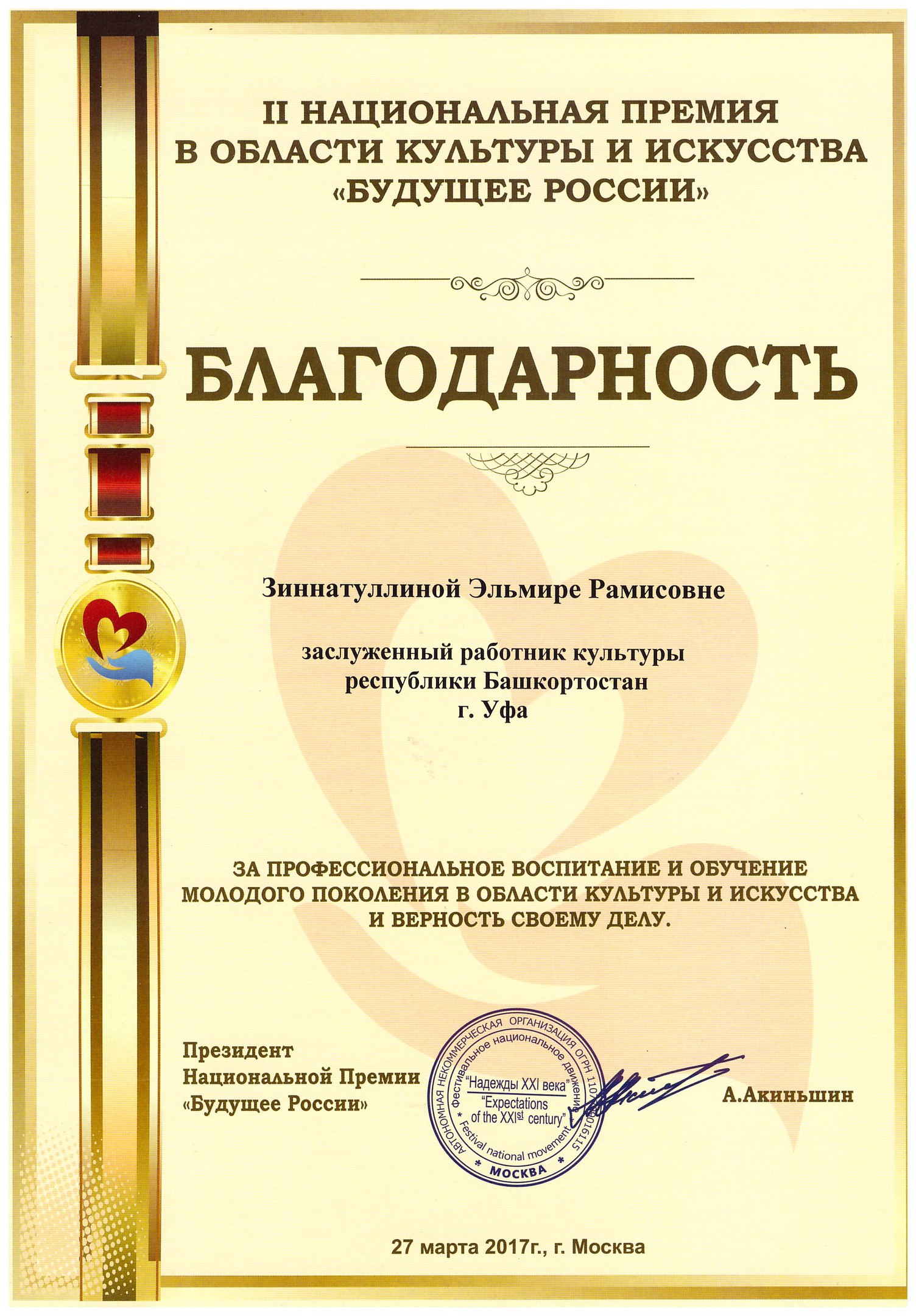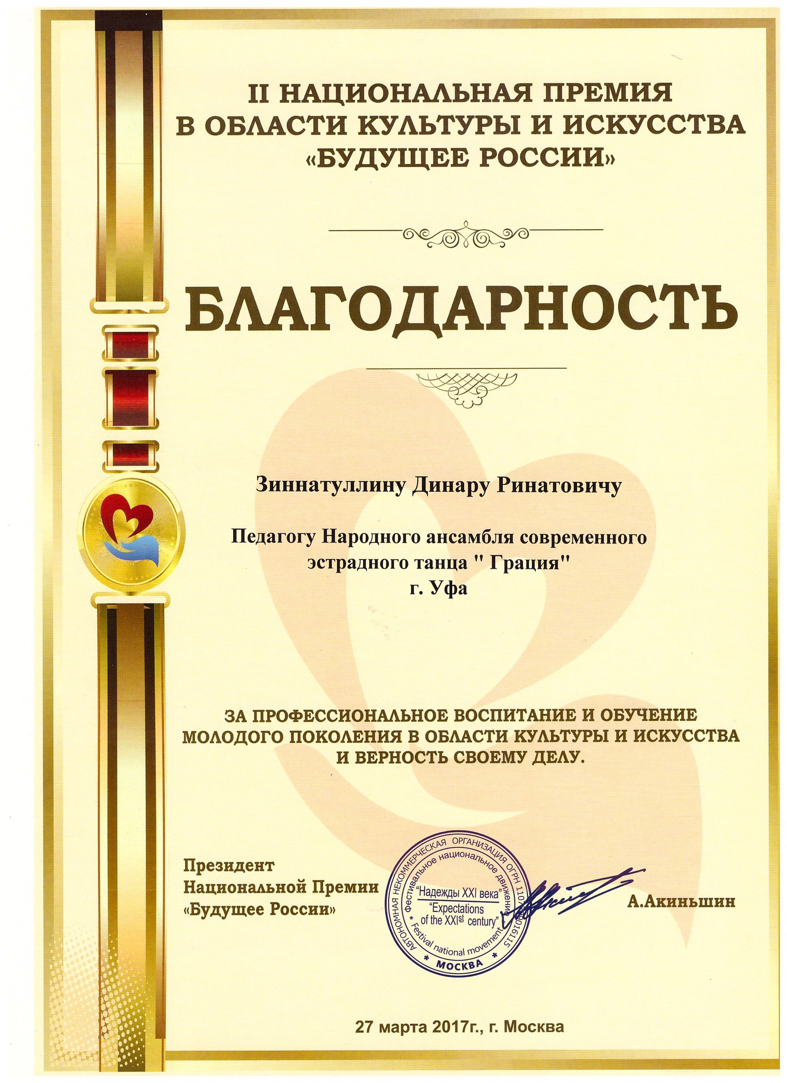 Финал конкурса проходил в течение 2-х дней. Сотни талантливых артистов бились за право стать лучшими! Участников было так много, что награждение проходило в 2 этапа. НАСЭТ «Грация» показал высочайший класс, за что был удостоен звания Финалиста II Премии в области культуры и искусства «Будущее России». Члены жюри отметили высококлассную работу руководителей коллектива – Зиннатуллиной Эльмиры Рамисовны и Зиннатуллина Динара Ринатовича. За свой вклад в современную культуру ансамбль получил кубок и почетные грамоты!