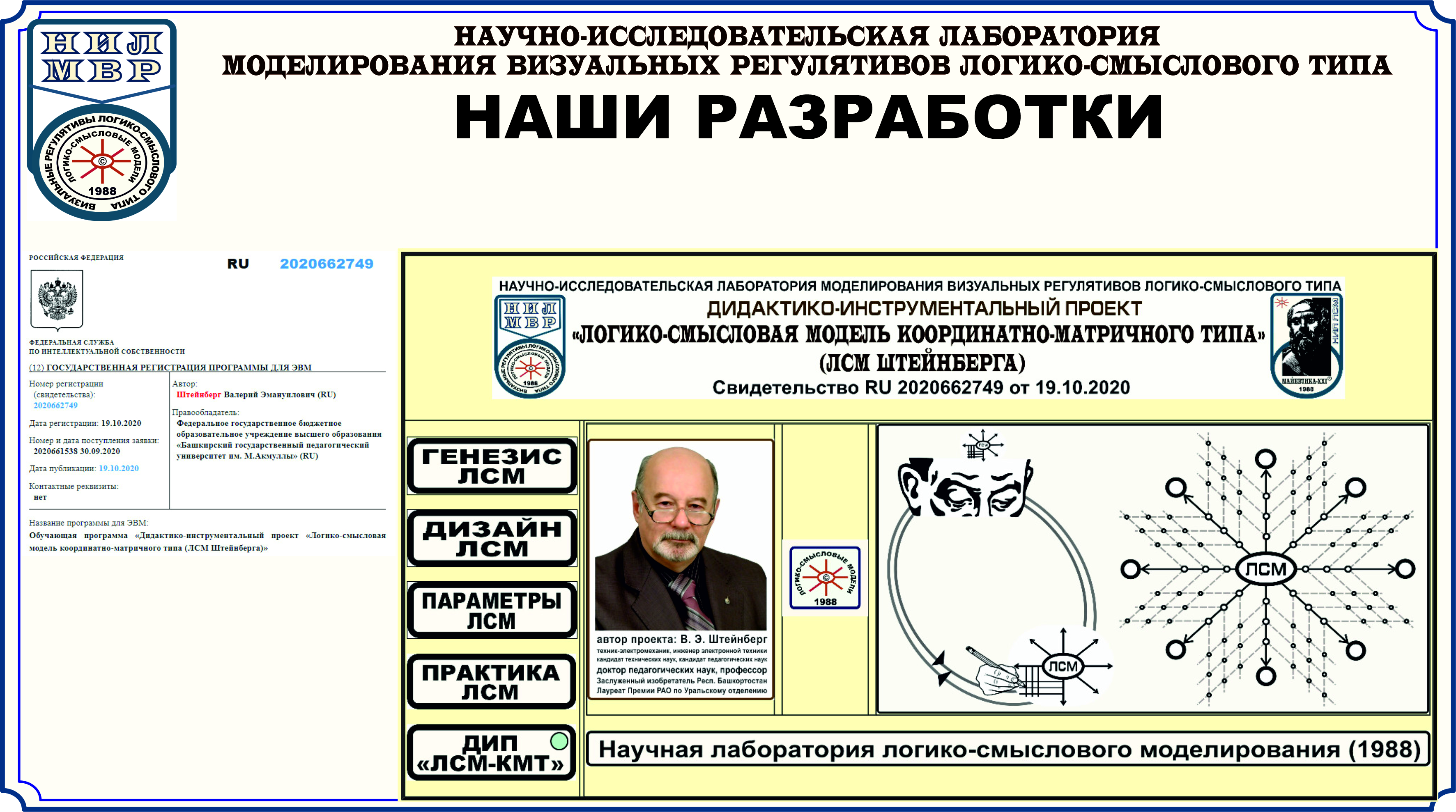 Федеральным институтом промышленной собственности выдано Свидетельство RU 2020662749  "Обучающая программа «Дидактико-инструментальный проект «Логико-смысловая модель координатно-матричного типа (ЛСМ Штейнберга)».
