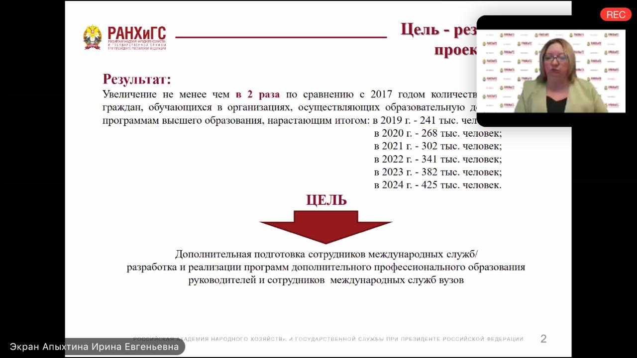 4 декабря 2020 года состоялся проблемно-целевой вебинар для  руководителей  и сотрудников  международных  служб  по  организации  работы  по  реализации мероприятий  федерального  проекта  (достижении  целевого  показателя удвоения численности иностранных студентов в российских вузах)   на тему: «Экспорт образования: результаты и перспективы». Организаторами вебинара выступили  РАНХиГС и РУДН.