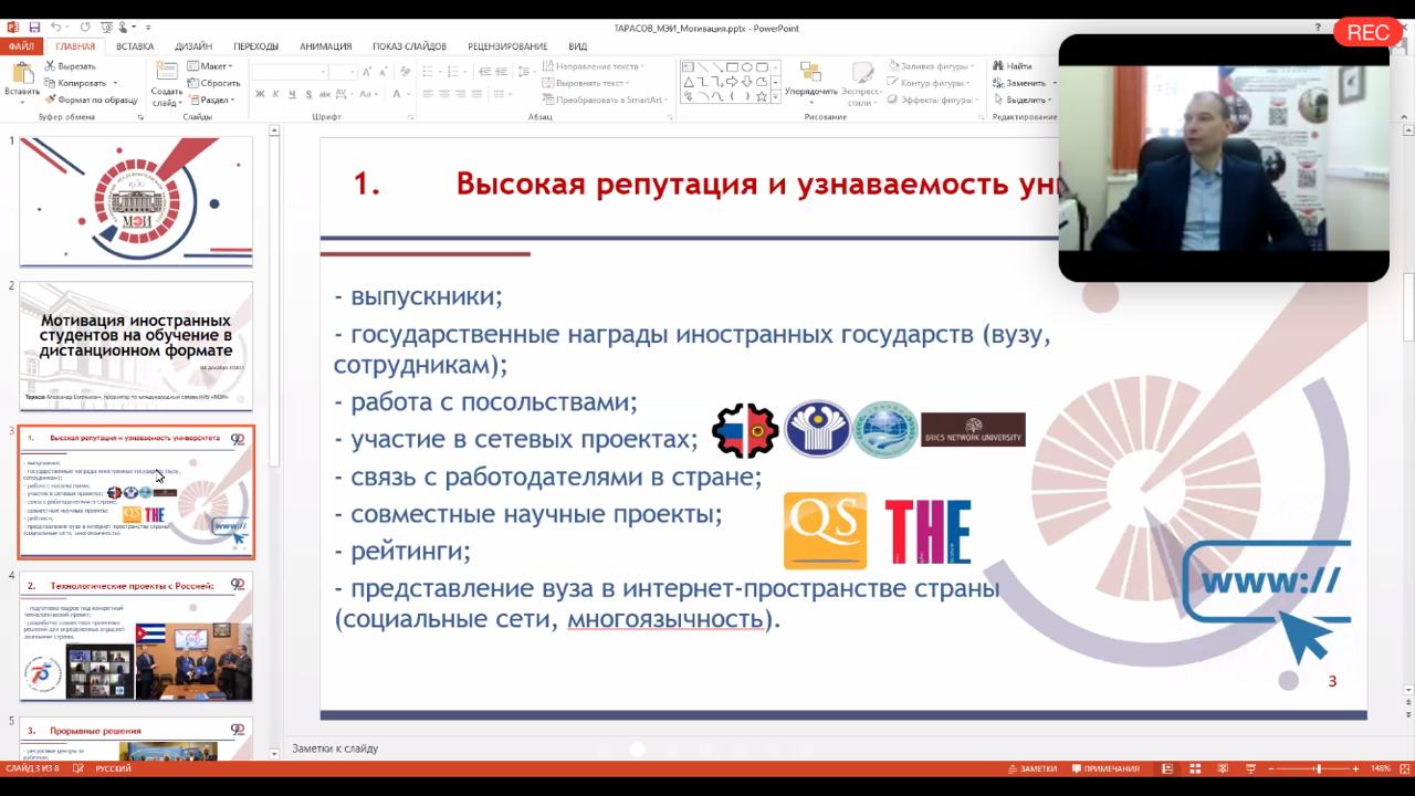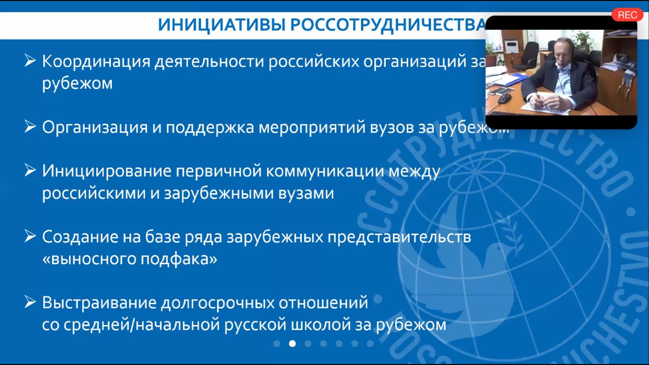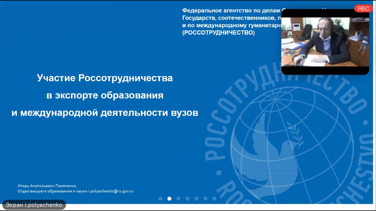 В рамках проблемно-целевого вебинара были подведены  итоги  года и  определение  перспективных  направлений реализации проекта в 2021 году. Так же участники вебинара обсудили наиболее проблемные вопросы, выявленным в ходе работы в 2020 году. Присутствующий на вебинаре начальник отдела сотрудничества в сфере высшего и  образования и науки Россотрудничества Игорь Анатольевич Поляченко подвел итоги приема иностранных студентов по квоте, а так же рассказал о дополнительных возможностях участия абитуриентов в отборе на получение квоты для обучения в российских вузах по программам аспирантуры.