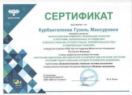 4 декабря 2020 года прошёл Всероссийский семинар «Реализация проектов и программ, направленных на поддержку и распространение русского языка: положительный опыт и комплексные решения» для руководителей и специалистов организаций-победителей конкурса проектов в рамках ведомственной целевой программы «Научно-методическое, методическое и кадровое обеспечение обучения русскому языку и языкам народов Российской Федерации» подпрограммы «Совершенствование управление системой образования» государственной программы Российской Федерации «Развитие образования» в 2019 и 2020 годах.