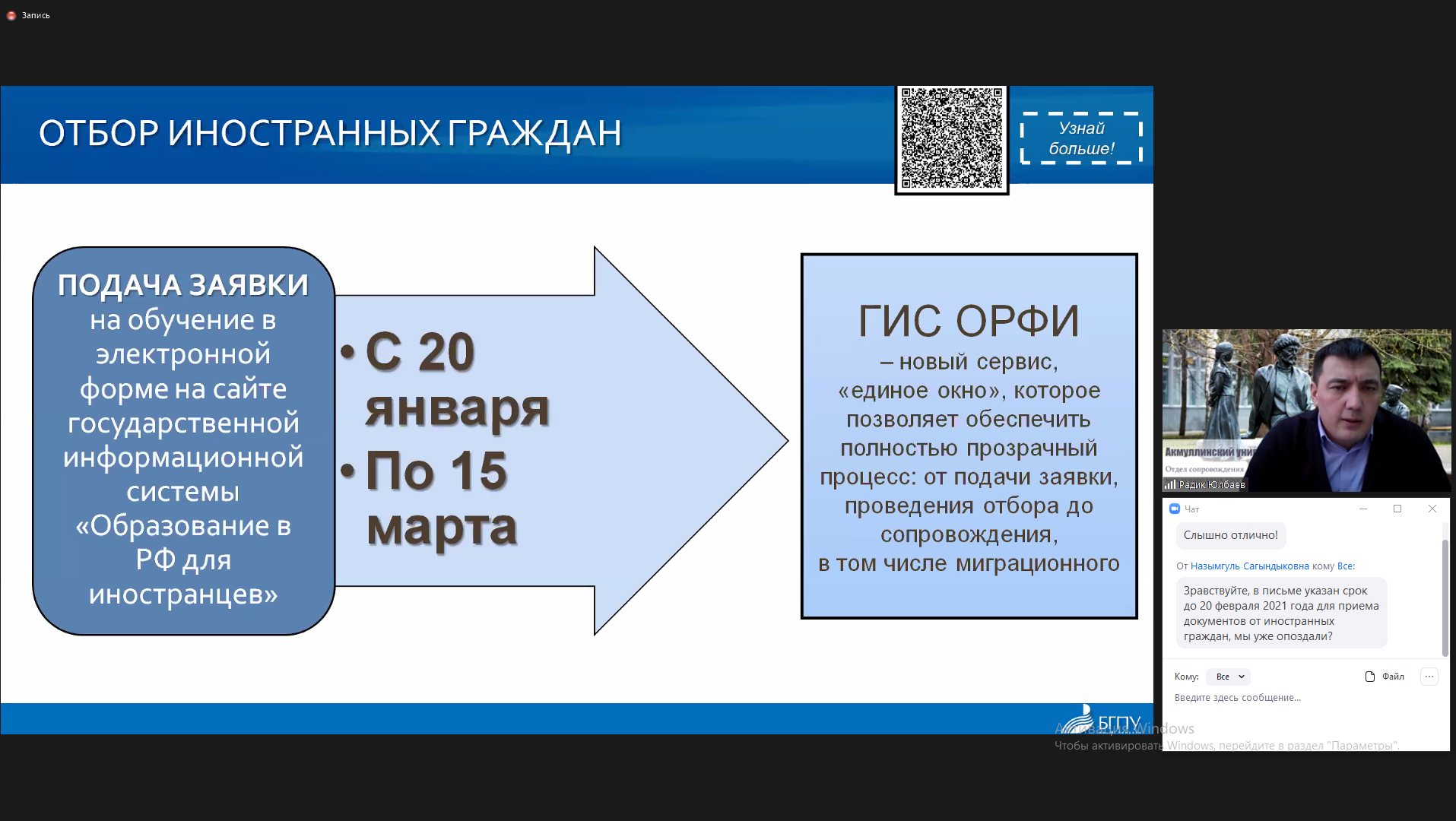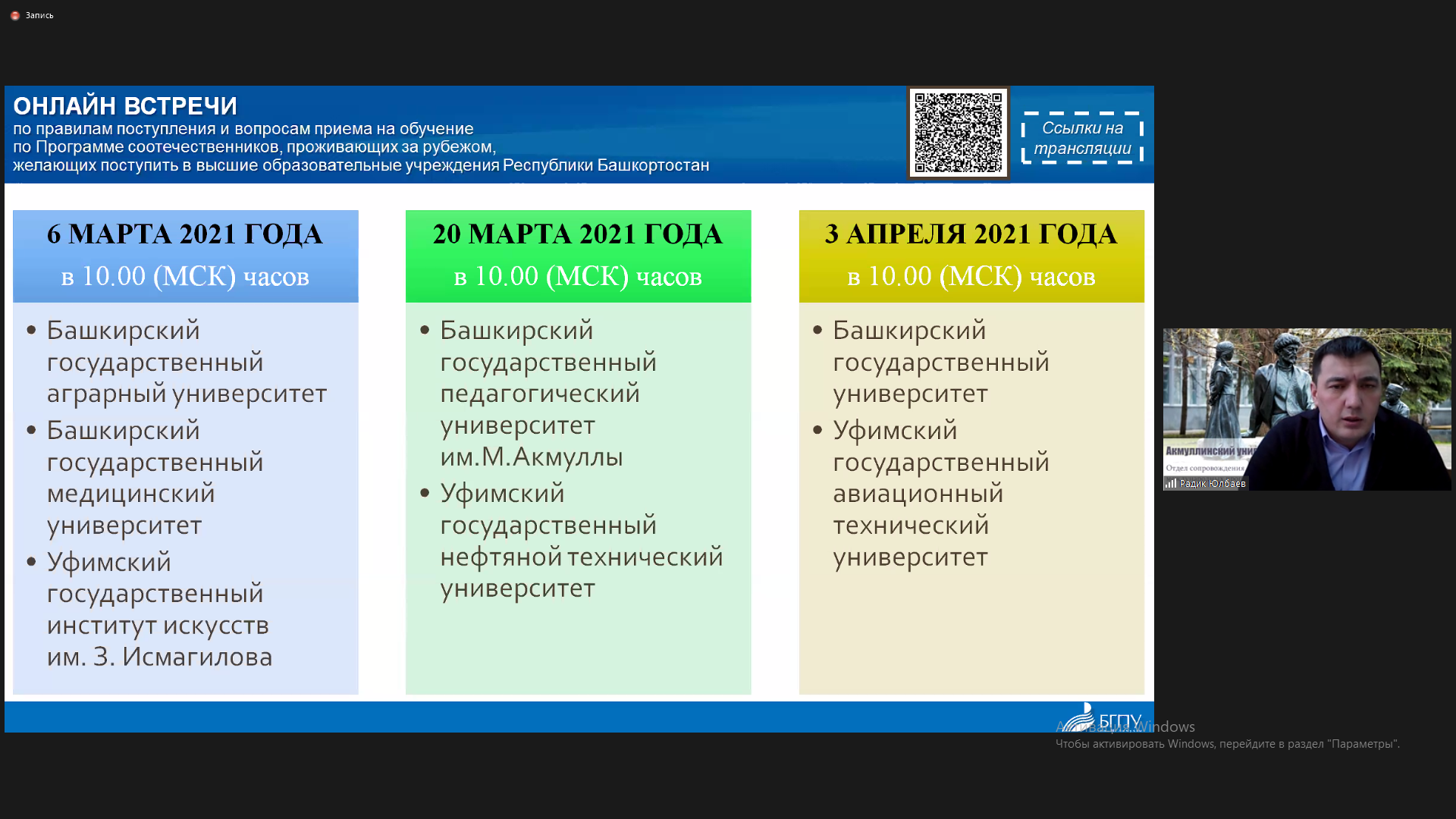 • директор центра профориентации «5К» БГПУ им.М.Акмуллы Тимерханов Фиданис с докладом «Особенности приемной кампании в 2021 году»;