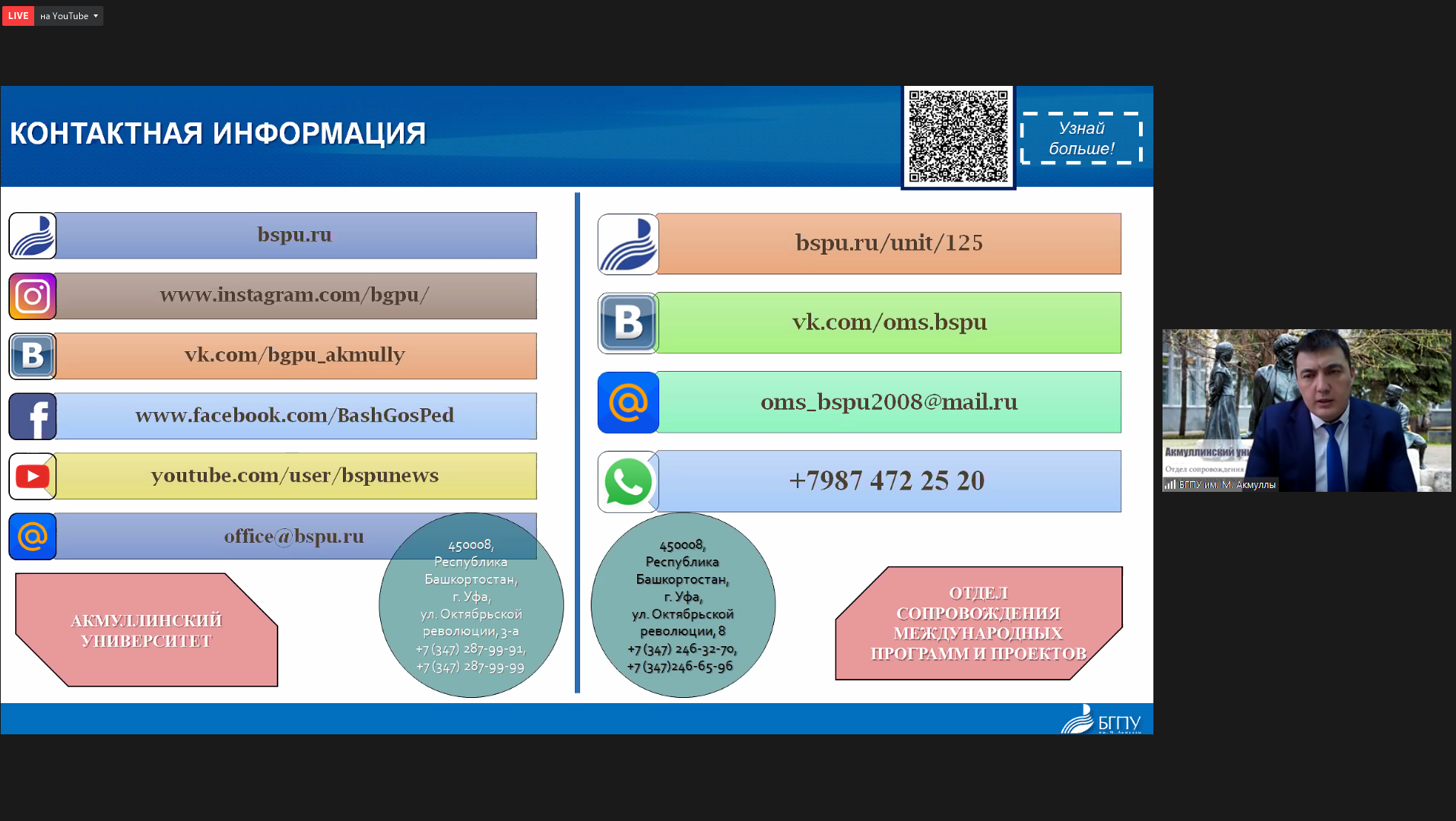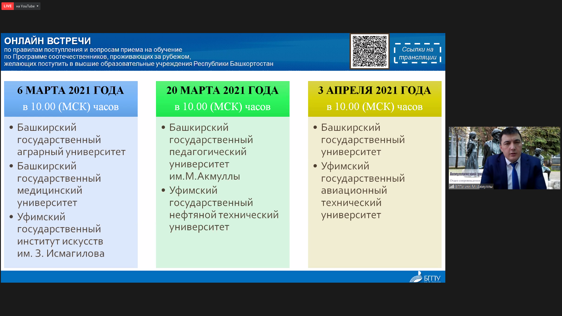 В том числе коллеги были приглашены на онлайн-встречи с ведущими вузами Республики Башкортостан, которые состоятся на платформе YouTube с уникальной возможностью в режиме реального времени обсудить интересующие вопросы поступления с представителями вуза.