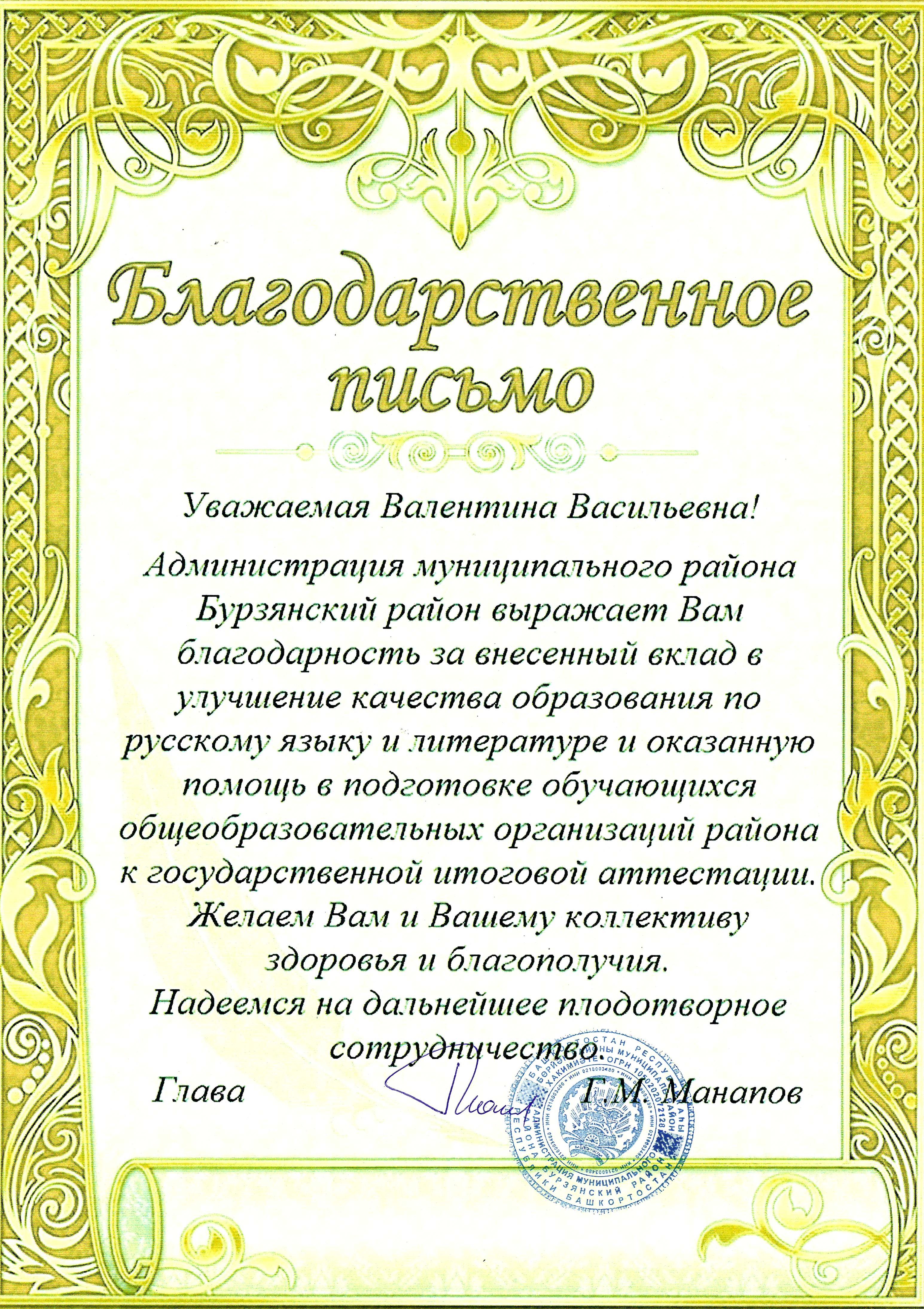 В рамках сотрудничества с Бурзянским отделом образования 13-14 марта преподаватели кафедры русской литературы профессор В.В. Борисова и доцент Ю.А. Жукова наряду с профориентационной работой  провели занятия с учителями по программе повышения квалификации и выпускниками школ по программе подготовки к ЕГЭ. За многолетнюю плодотворную работу администрация Бурзянского района вручила благодарственное письмо зав. кафедрой русской литературы В.В. Борисовой, много лет обеспечивающей многогранную деятельность Центра подготовки к ГИА по русскому языку и литературе при ИФОМК БГПУ им. М. Акмуллы.
