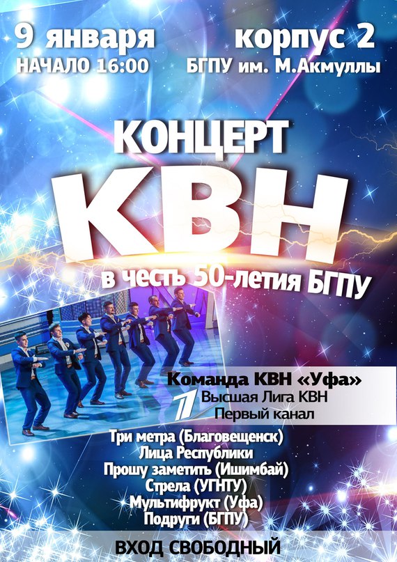 9 января 2017 года в Уфе соберутся лучшие команды Республики Башкортостан с праздничной программой КВН-концерт. Своё юмористическое выступление они посвятят 50-летию Башкирского государственного педагогического университета им. М. Акмуллы. Участники выступят с лучшими номерами, которые представят в Международном фестивале команд КВН в городе Сочи.