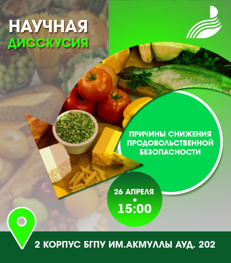 26 апреля в 15:00 по поручению Государственного Собрания – Курултая Республики Башкортостан на базе БГПУ им. М.Акмуллы состоится научная дискуссия на тему «О причинах снижения Продовольственной Безопасности: научные, экономические, социальные и философские аспекты».