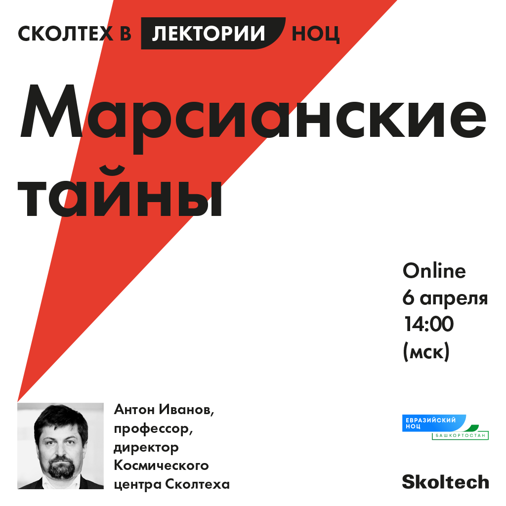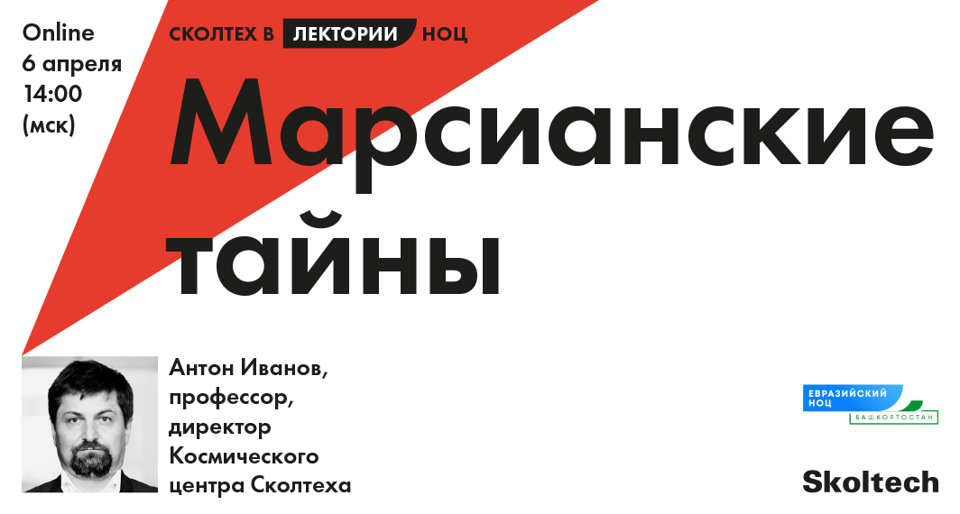 6 апреля 2021 г. (вторник) в 14:00 (время московское) состоится онлайн-лекция директора Космического центра Сколтеха, профессора Антона Иванова «Марсианские тайны».