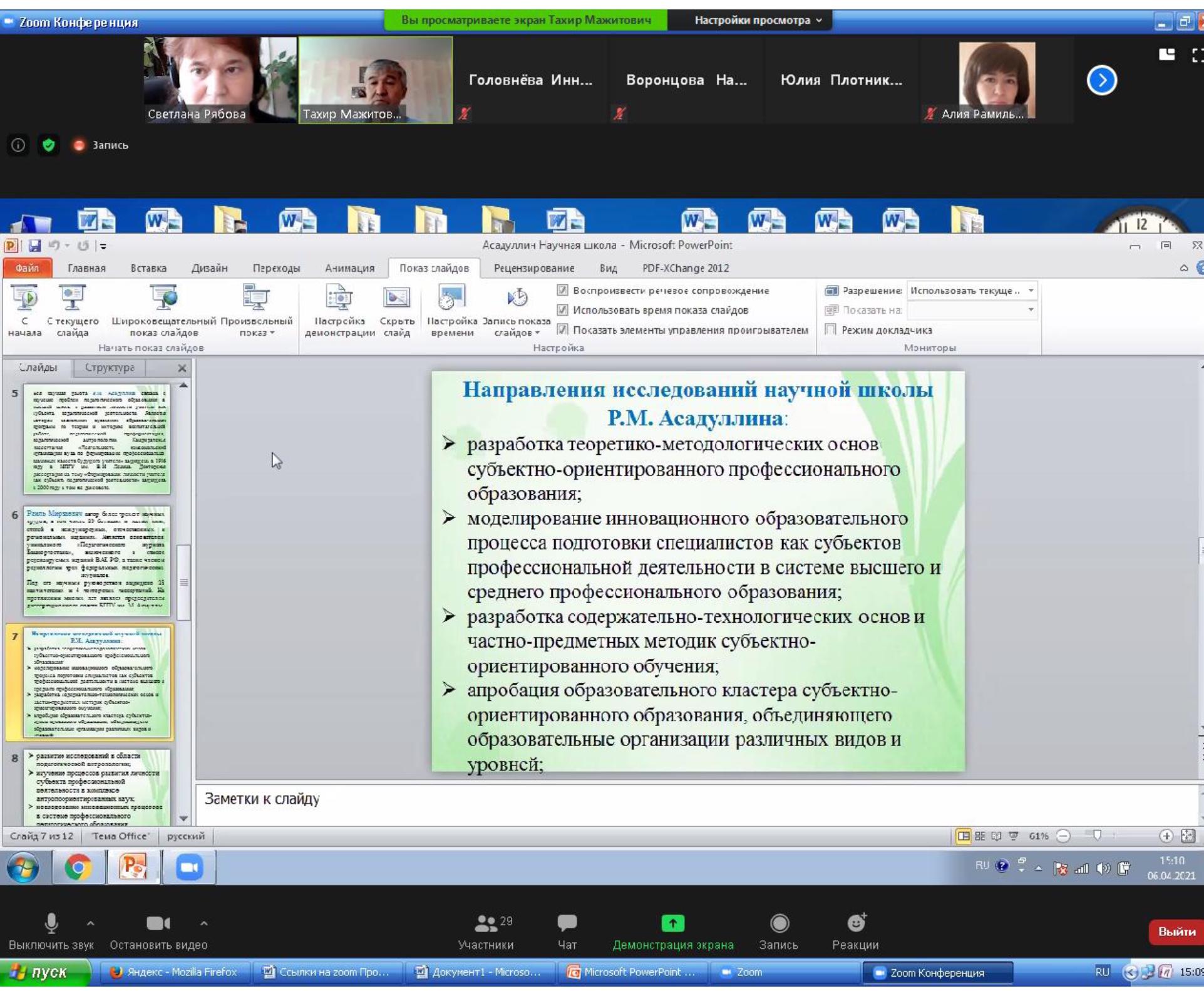 В онлайн формате прошла первая презентация образовательных программ по направлению подготовки кадров высшей квалификации 44.06.01 Образование и педагогические науки.  В мероприятии  приняли участие более 30 магистрантов, в том числе из зарубежных стран. Заведующие профильными кафедрами и ведущие профессора представили основные направления научной работы в рамках образовательных программ, которые помогут будущим аспирантам выбрать тему для исследования. Сытина Надежда Степановна представила  актуальные  научные разработки кафедры педагогики и психологии. Среди них инклюзивное образование, музыкальная педагогика, работа с одаренными детьми и др.  Вахидова Люция Вансеттовна выступила с характеристикой научных исследований в области профессиональной педагогики, которые разрабатываются на кафедре профессионального и социального образования. Профессор Аминов Тахир Мажитович  рассказал о научной школе «Педагогика субъектно-ориентированного образования», которую возглавляет д-р пед. наук, профессор, директор научно-исследовательского Института стратегии развития образования  Асадуллин Раиль Мирваевич.