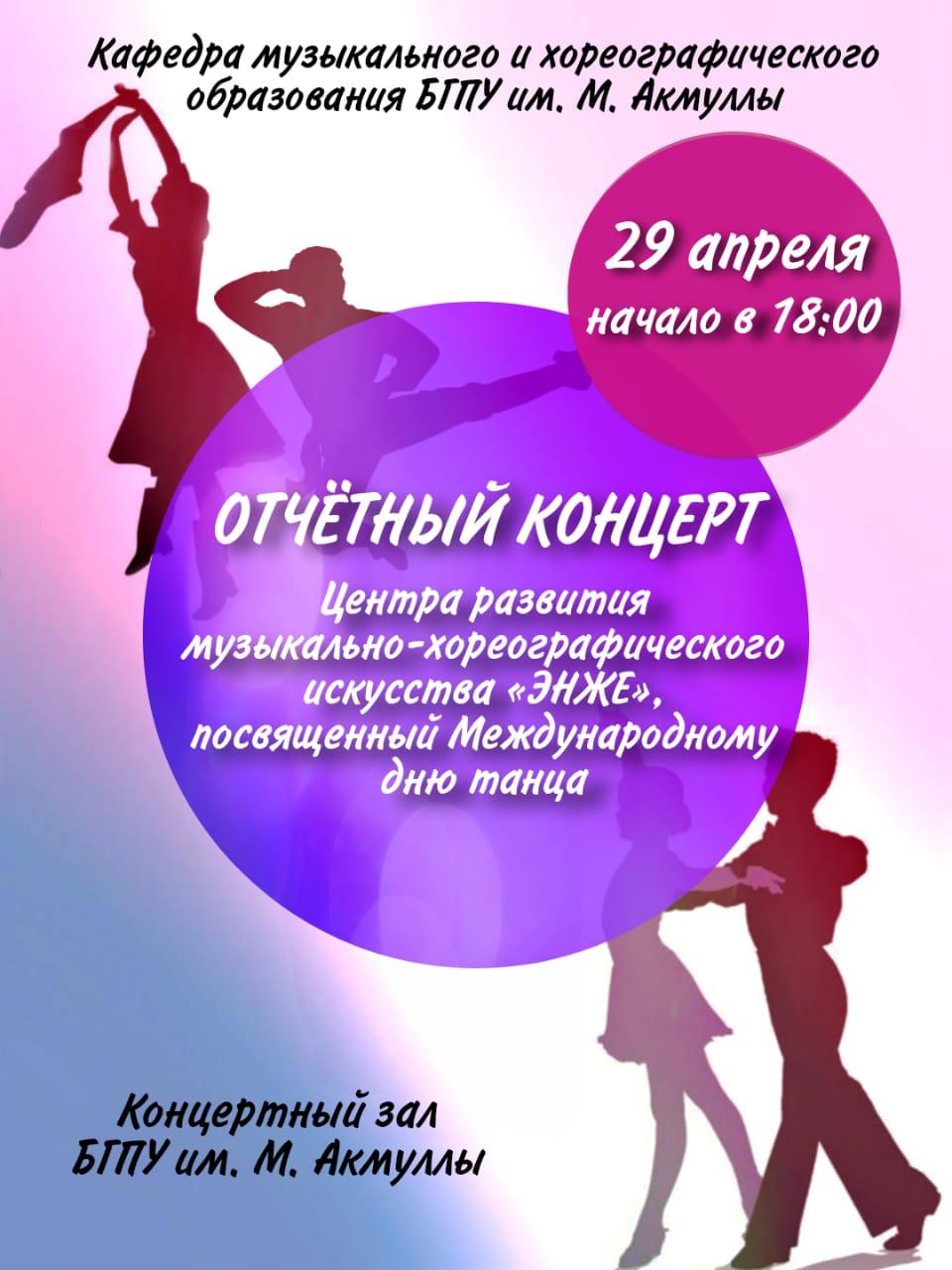 29 апреля 2021 г. кафедра музыкального и хореографического образования приглашает на отчетный концерт Центра развития музыкально-хореографического искусства "Энже", посвященный Международному дню танца!