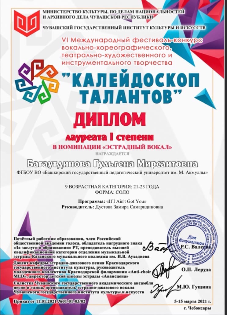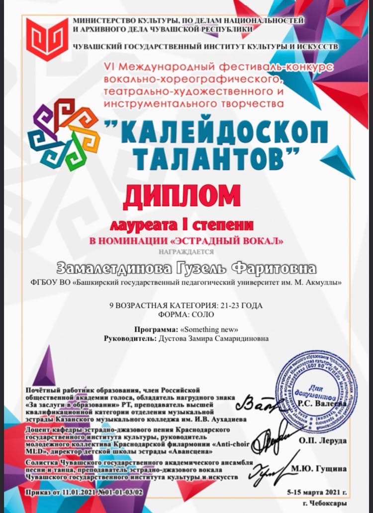 Весной 2021 года в Республике Чувашия прошел VI Международный фестиваль вокально-хореографического, театрально-художественного и инструментального творчества "Калейдоскоп талантов". По результатам конкурса студенты кафедры музыкального и хореографического образования стали победителями, заняв почетные первые места.