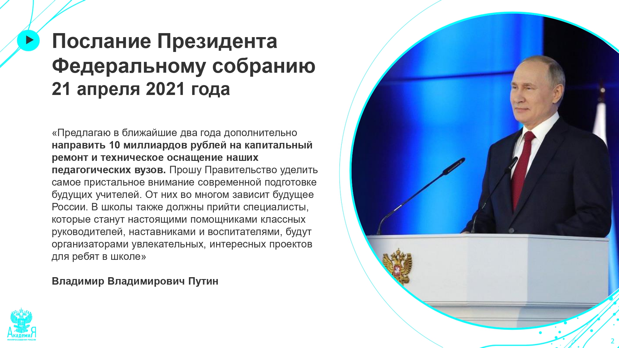 В июле текущего года Министерство просвещения России распределило средства на модернизацию педагогических вузов страны. Дополнительное финансирование в размере 10 млрд рублей за два года поручил выделить Президент страны Владимир Путин, выступая перед Федеральным Собранием в  апреле.