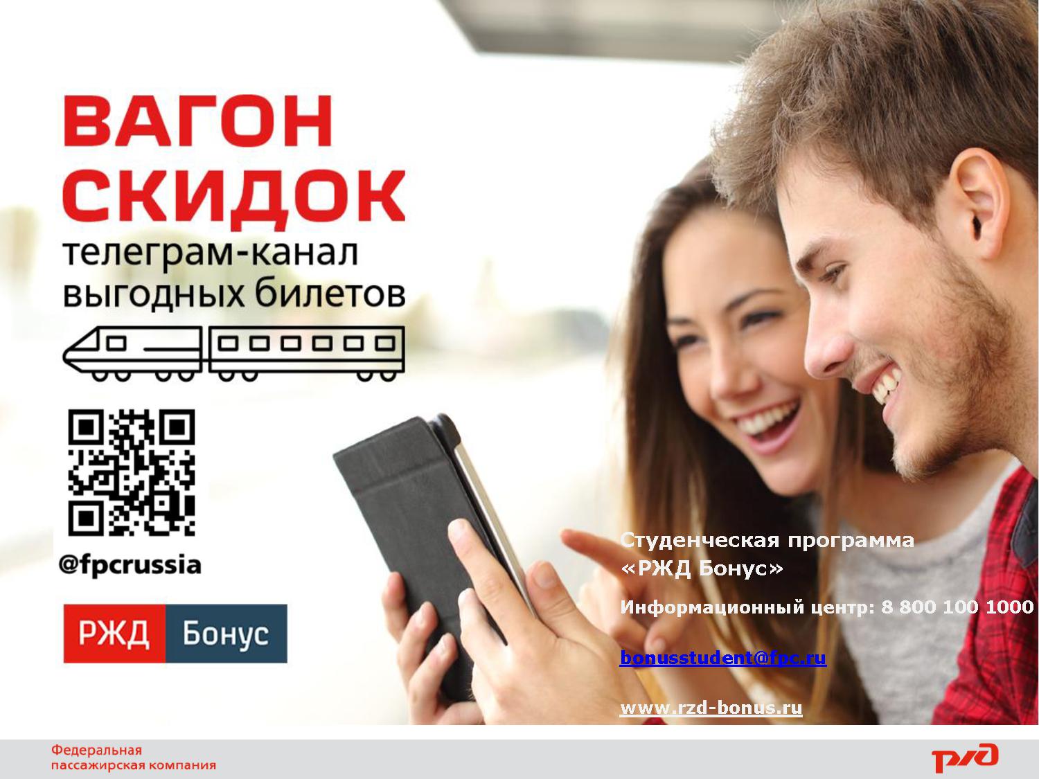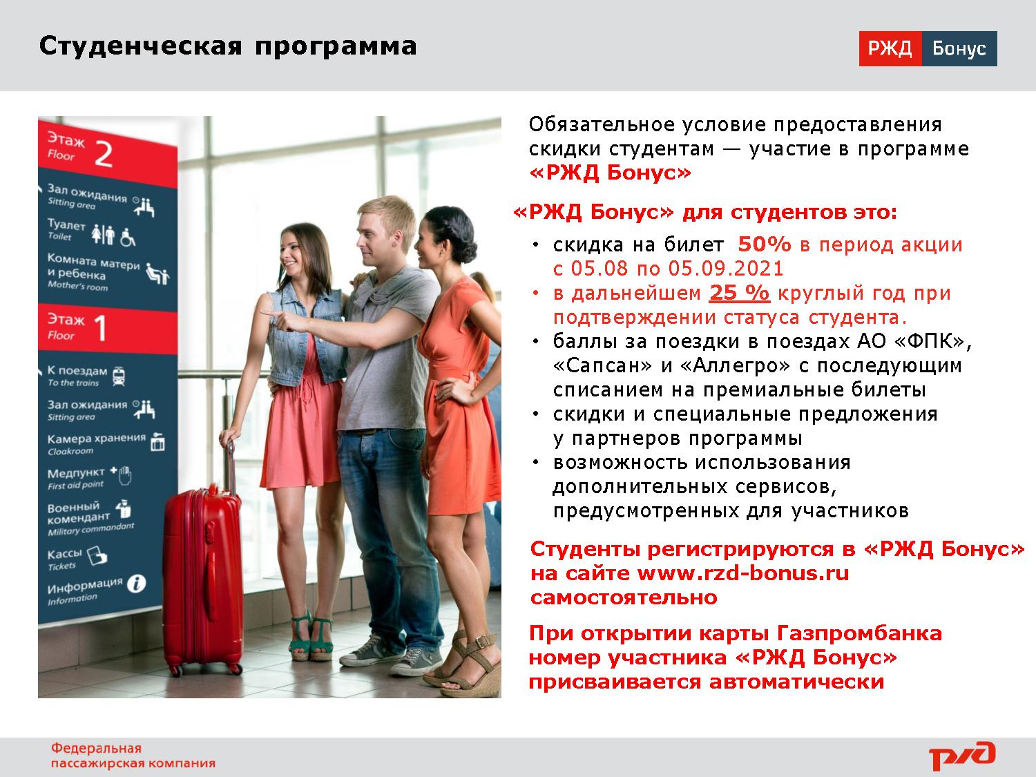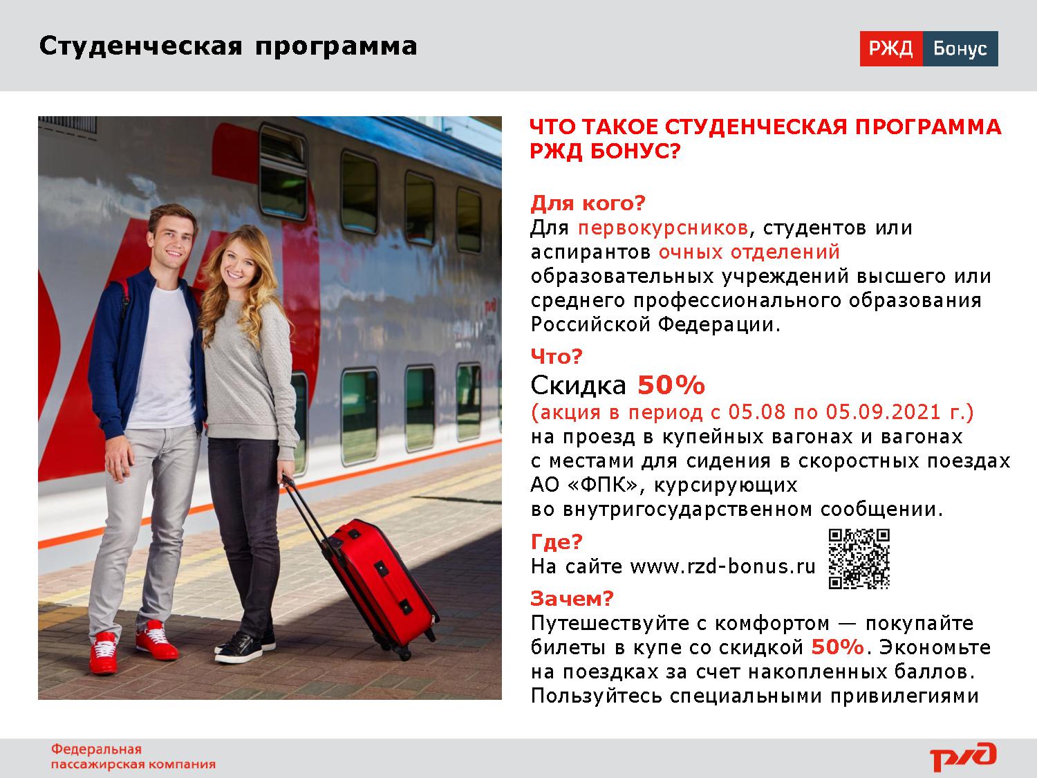 «РЖД Бонус» дарит повышенную скидку 50% студентам и первокурсникам 2021 года до конца лета. Акция проводится в период с 05.08.2021 г. по 05.09.2021 г. Скидку могут получить студенты и аспиранты очных отделений учебных учреждений высшего и среднего профессионального образования Российской Федерации, в том числе студенты-первокурсники 2021 года поступления. Скидка действует в вагонах купе поездов дальнего следования и вагонах с местами для сидения скоростных поездов АО «ФПК», курсирующих во внутригосударственном сообщении. Скидка в размере 50% от применяемого тарифа на проезд.