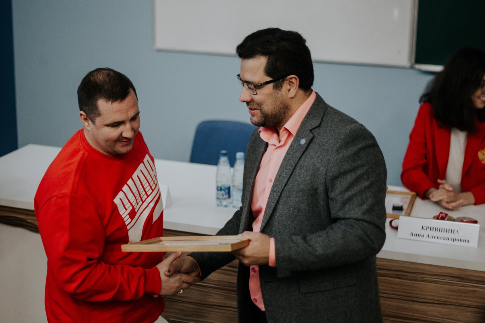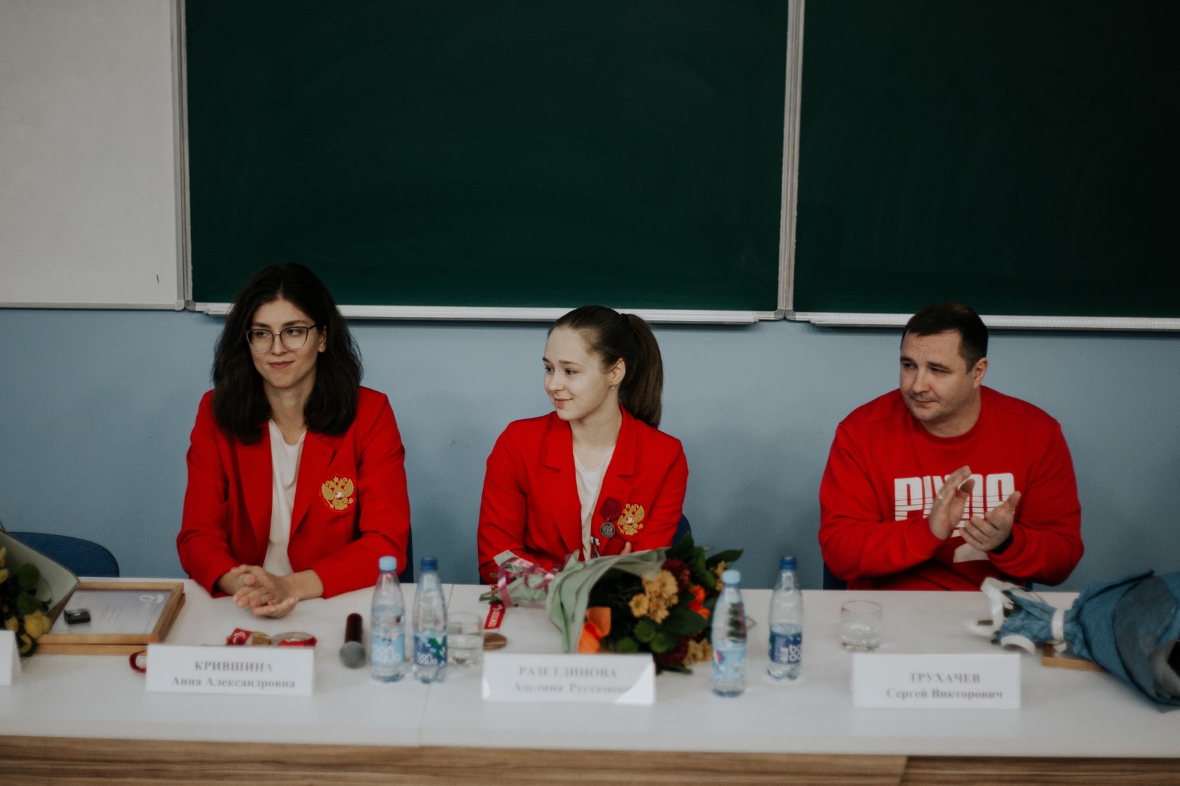 - Вы большие молодцы. Вы победили многое, сделали и делаете невозможное. Есть предел человеческих возможностей, а вы где-то за этим пределом. Мы счастливы, что наш университет имеет к этому отношение, прекрасно понимая, что это ваша заслуга и ваших родителей и тренеров, которые многие годы с вами работали. И если чуть-чуть есть доля университета в вашей победы, мы очень рады, что смогли помочь. Мы очень благодарны вам за ваш характер, ваше отношение, за то, что вы поддерживаете связь с университетом. Это важно для ребят, которые учатся у нас, увлекаются спортом. Очень приятно поздравить вас сегодня. И выразить благодарность вашим родителям и тренерам, которые помогли вам стать чемпионами.