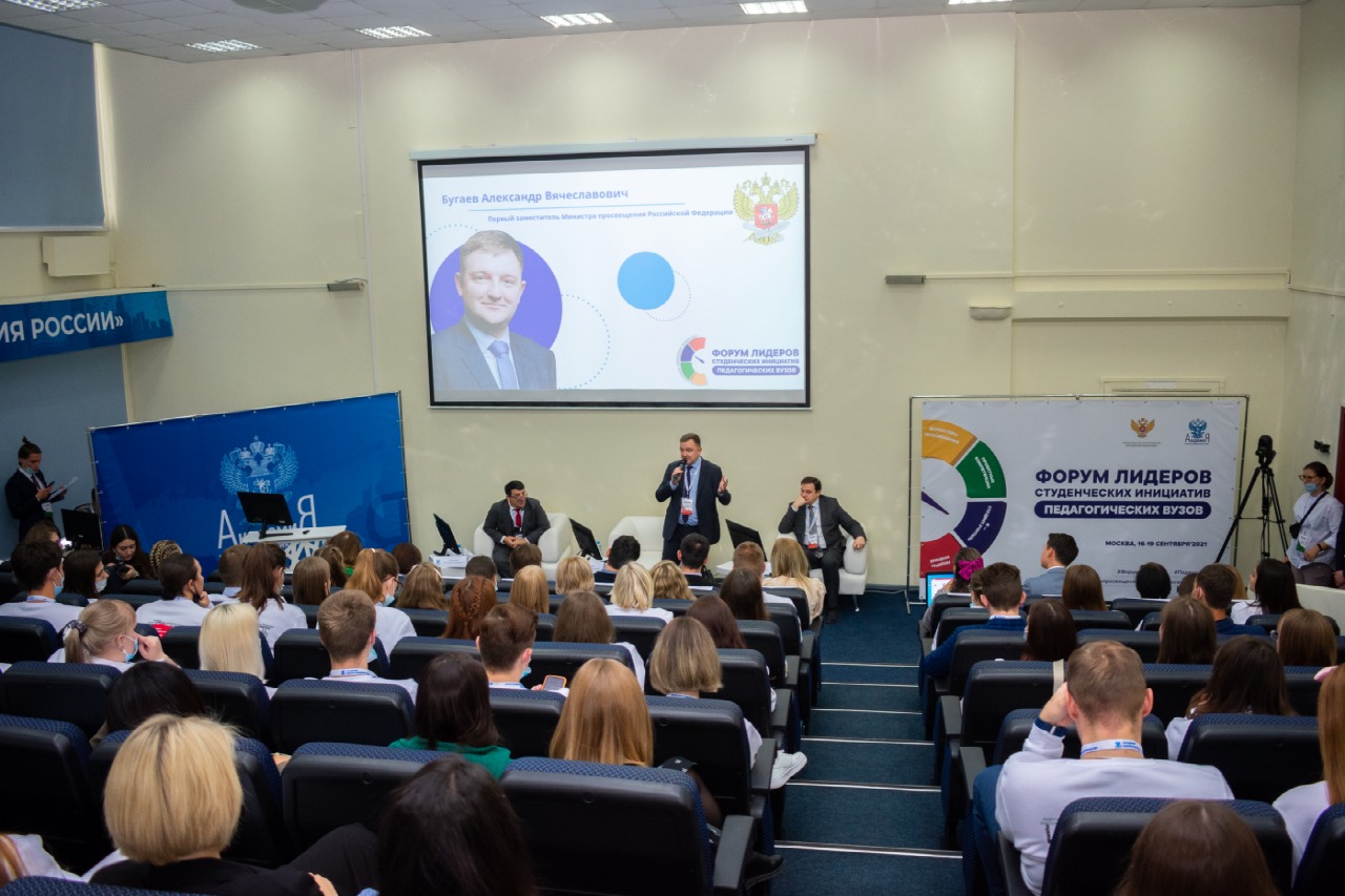 Центральным событием Форума стала встреча студенческих лидеров педагогических вузов с первым заместителем Министра просвещения Российской Федерации Александром Бугаевым, который подчеркнул важность профессии учителя: «Мы, по сути, педагогическая семья, в руках которой будущее нашей страны. Это важнейшая миссия, которая лежит на плечах учителей, педагогов».