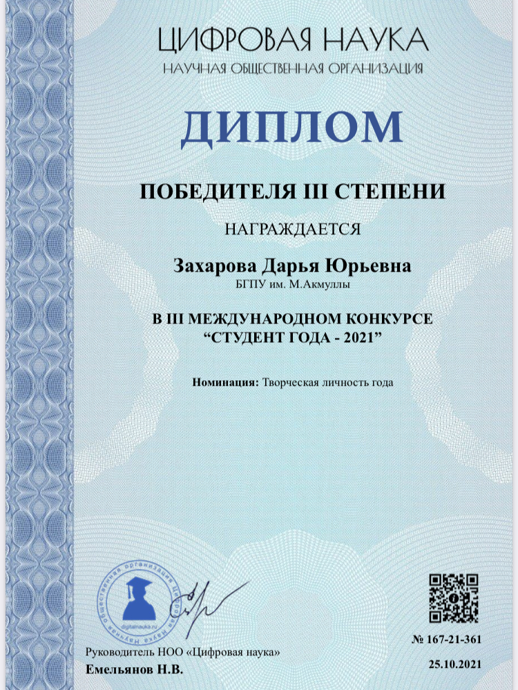 В ноябре 2021 г. на базе научно-образовательной платформы "Цифровая наука" прошел III Международный конкурс "Студент года - 2021".