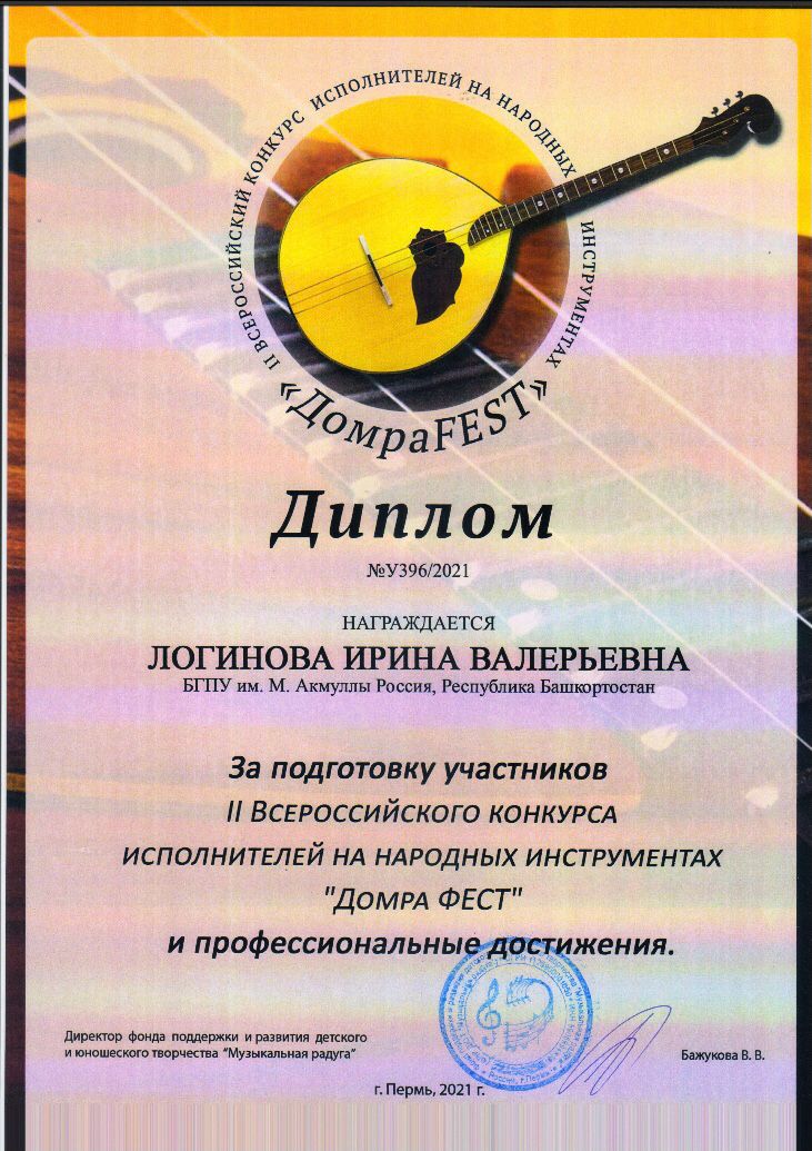 Студентка кафедры музыкального и хореографического образования Айгуль Ахметшина стала лауреатом III степени в номинации "Домбра, соло (21-23 года)" во II Всероссийском конкурсе исполнителей на народных инструментах "ДомбраFEST", который состоялся в г. Пермь. Поздравляем также педагога Логинову Ирину Валерьевну и  концертмейстера Гарнизорову Ирину Александровну.
