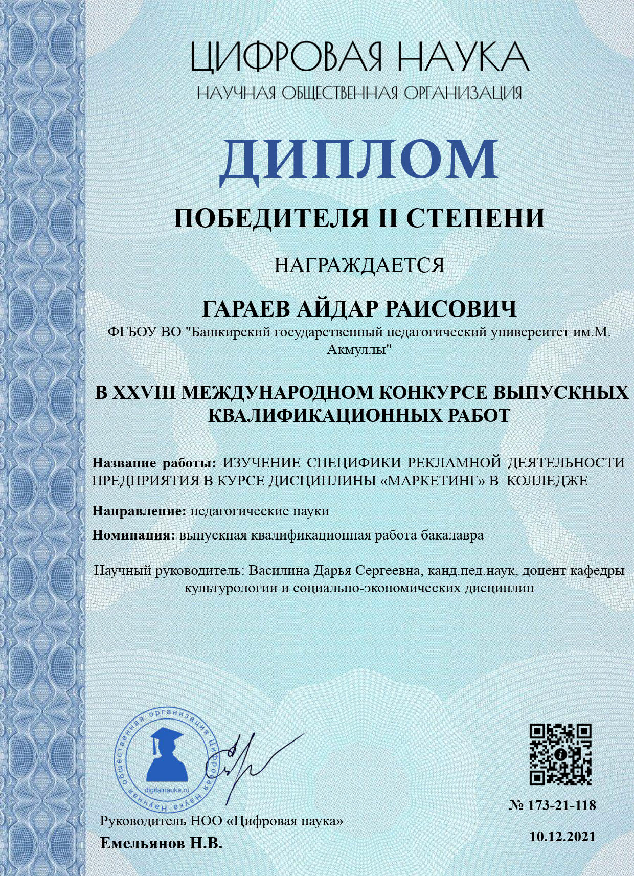 Айдар Раисович Гараев – диплом II степени в номинации «Педагогические науки» (за работу «ИЗУЧЕНИЕ СПЕЦИФИКИ РЕКЛАМНОЙ ДЕЯТЕЛЬНОСТИ ПРЕДПРИЯТИЯ В КУРСЕ ДИСЦИПЛИНЫ «МАРКЕТИНГ» В КОЛЛЕДЖЕ», научный руководитель – Дарья Сергеевна Василина, канд.пед.наук, доцент кафедры культурологии и социально-экономических дисциплин);