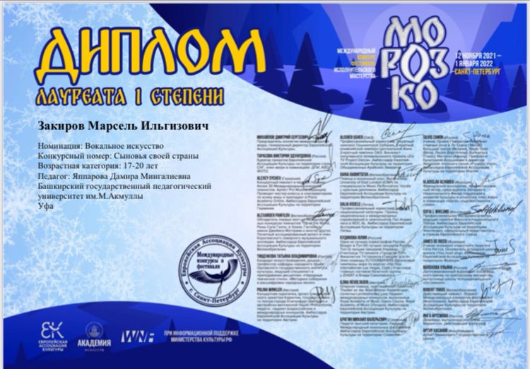 Студент 3 курса кафедры МХО Марсель Закиров стал Лауреатом I степени Международного конкурса-фестиваля исполнительского мастерства "Морозко" в номинации "Вокальное искусство" возрастной категории 17-20 лет. На суд жюри Марсель представил конкурсный номер "Сыновья своей страны". Поздравляем студента и его педагога - Дамиру Мингалиевну Яппарову - с высоким достижением. Желаем новых творческих успехов в наступающем году!