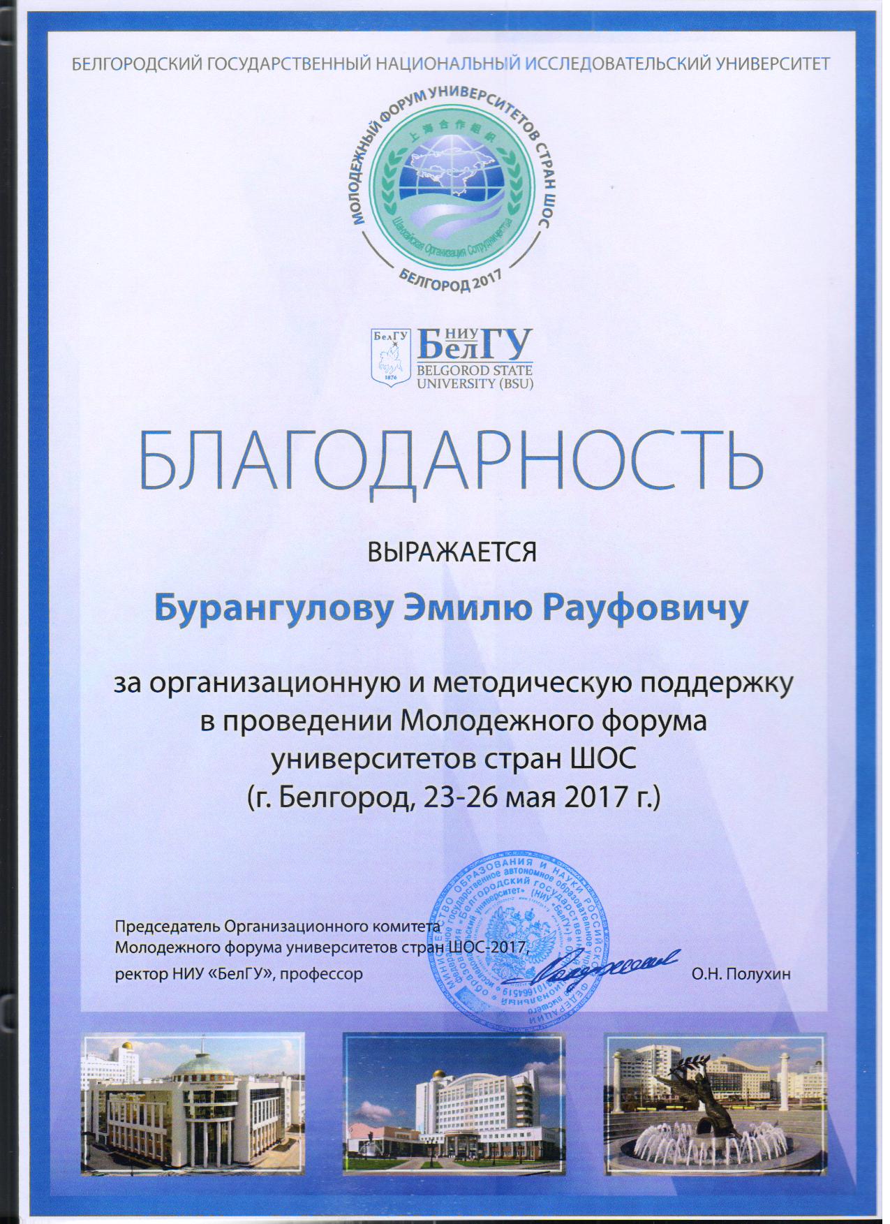 23-26 мая 2017 года в Белгородском государственном национальном исследовательском университете состоялся II Международный молодежный форум университетов стран ШОС, участие в котором принял начальник отдела сопровождения международных программ и проектов Э.Р. Бурангулов. Также участниками форума стали 30 делегаций из вузов России и зарубежья, в том числе университеты Белгородской области и 11 вузов из стран-участниц ШОС: Китая, Индии, Пакистана, Казахстана, Кыргызстана, Узбекистана и Таджикистана.