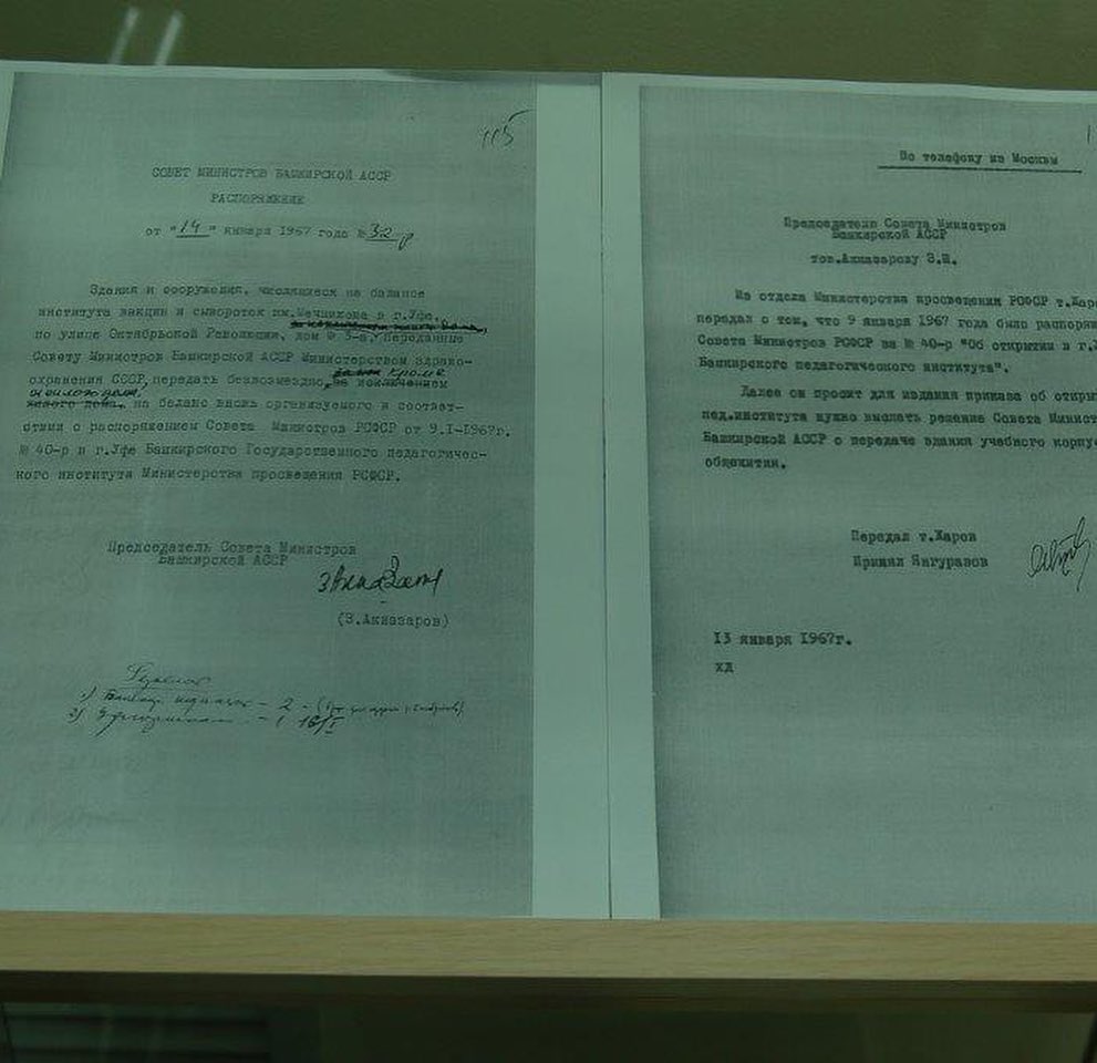 Башкирский государственный педагогический институт в г. Уфе образован в соответствии с Распоряжением Совета Министров РСФСР от 9 января 1967 года. В экспозиции представлено Распоряжение Совета Министров Башкирской АССР от 14 января 1967 года о безвозмездной передаче зданий и сооружений по улице Октябрьской Революции, числящихся на балансе Института вакцин и сывороток им. Мечникова, а также дома № 3-а на баланс вновь организуемого Башкирского государственного педагогического института Министерства просвещения РСФСР.