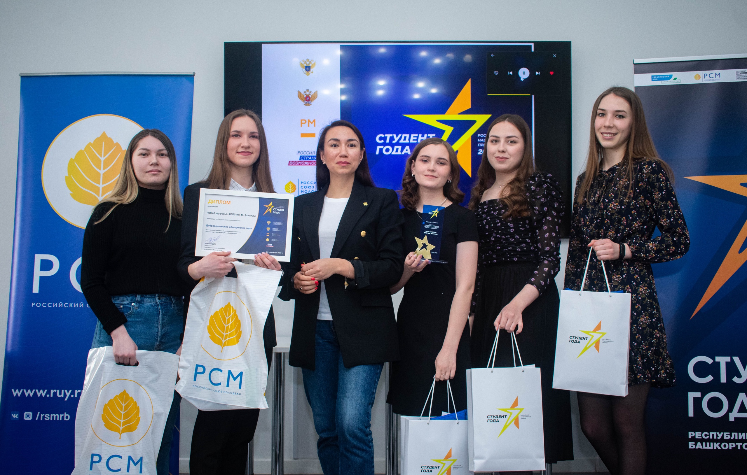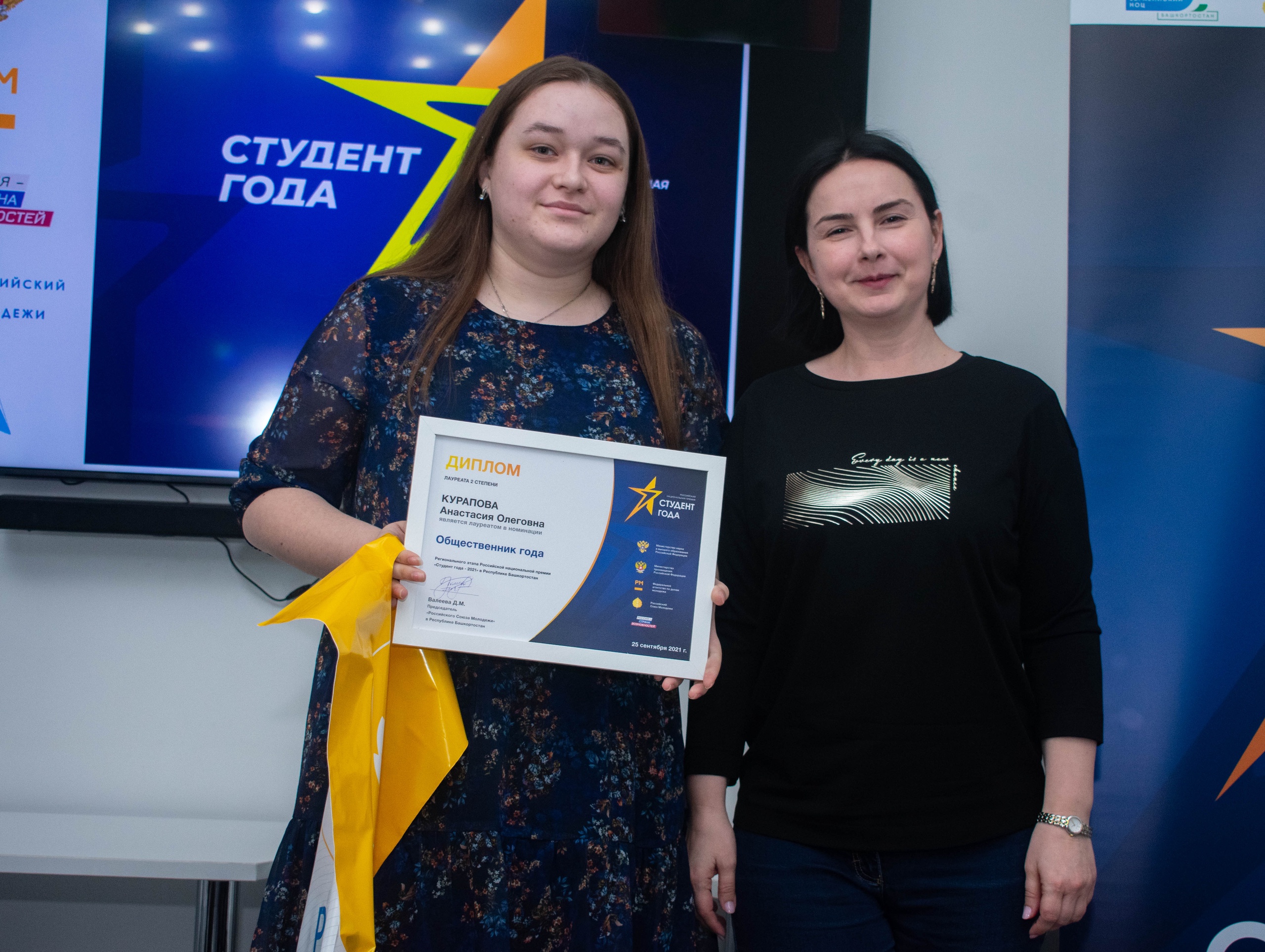 Региональное отделение Российского Союза Молодежи наградило победителей и призеров регионального этапа премии «Студент года-2021». В 2021 году организаторы премии получили более 350 заявок от самых талантливых и активных студентов республики. Из них были отобраны 37 победителей и призеров в 18 номинациях, 7 групповых номинаций.